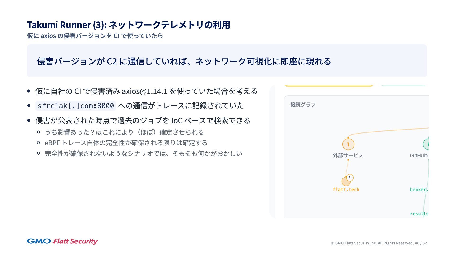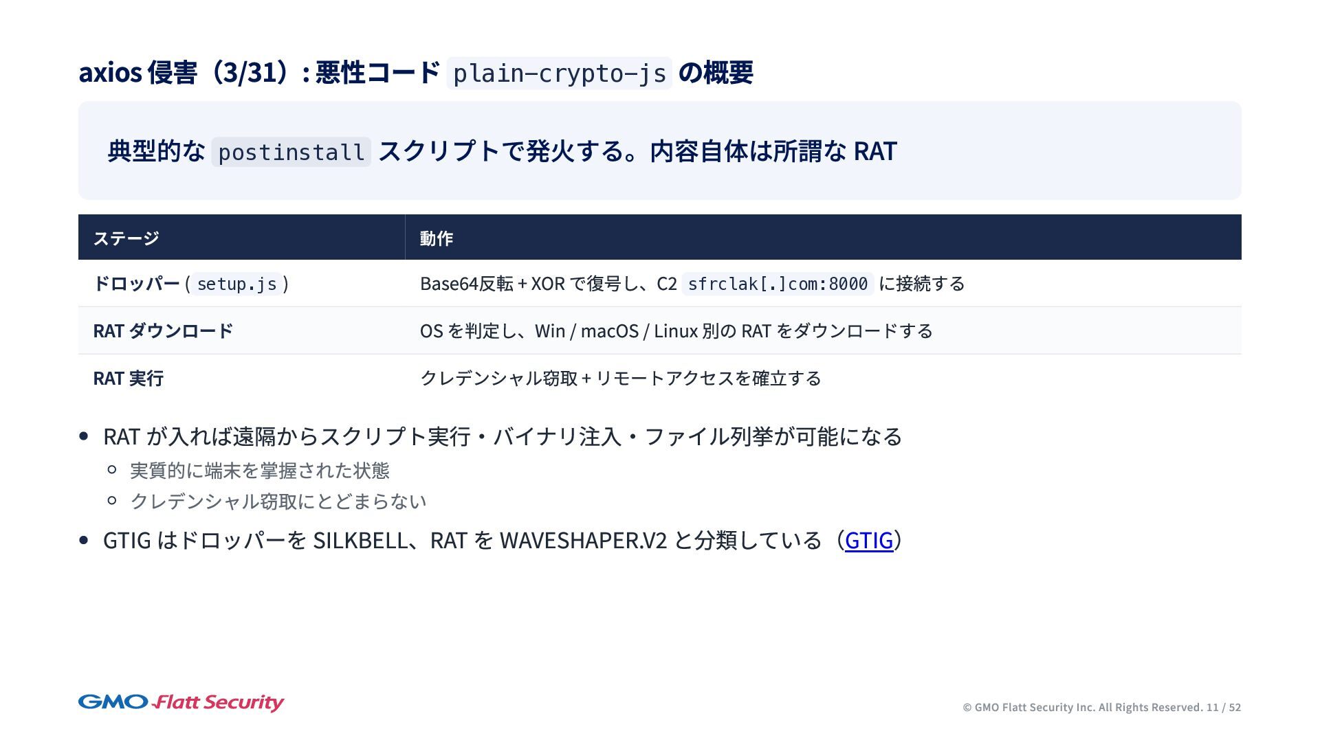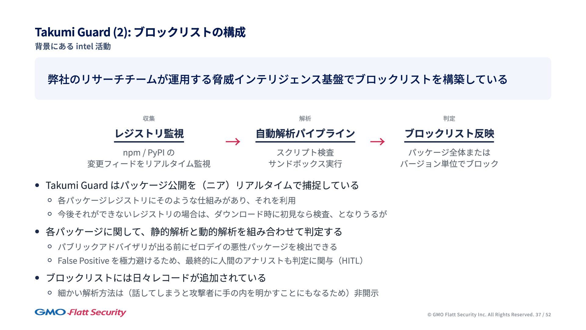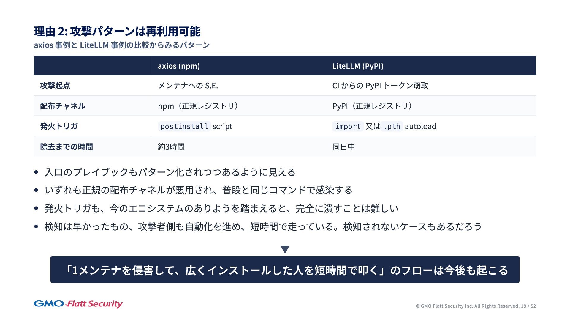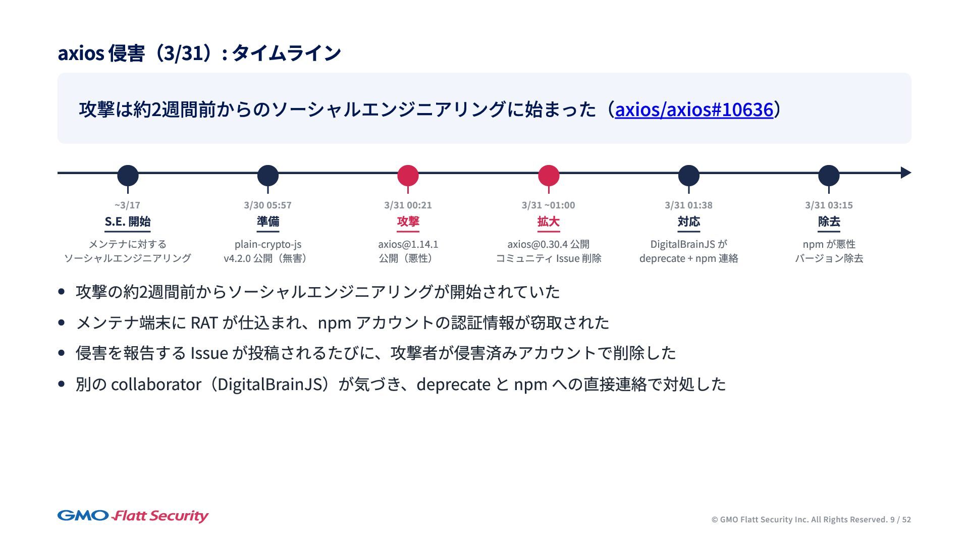 [email protected] ← npm が自動的に解決した(あなたは選んでいない) postinstall: node setup.js ← npm が自動的に実行した npm はパッケージの postinstall スクリプトを install 時に自動実行する 推移的依存のスクリプトも実行される。gatsby を入れただけで axios の postinstall が走る 構造的には、これさえ無ければ、攻撃のステップは 1 つ増える(→ 攻撃者にとって面倒が増える) 実際、pnpm v10~ はこの挙動をデフォルトでブロックする方向に転じている 許可リスト( allowBuilds )に明示的に登録したパッケージのみ実行を許可する挙動をとる Bun も Top 500 パッケージの許可リスト + trustedDependencies で制御しているよう 構造 1: install 時のコード自動実行の仕組みがある © GMO Flatt Security Inc. All Rights Reserved. 23 / 52