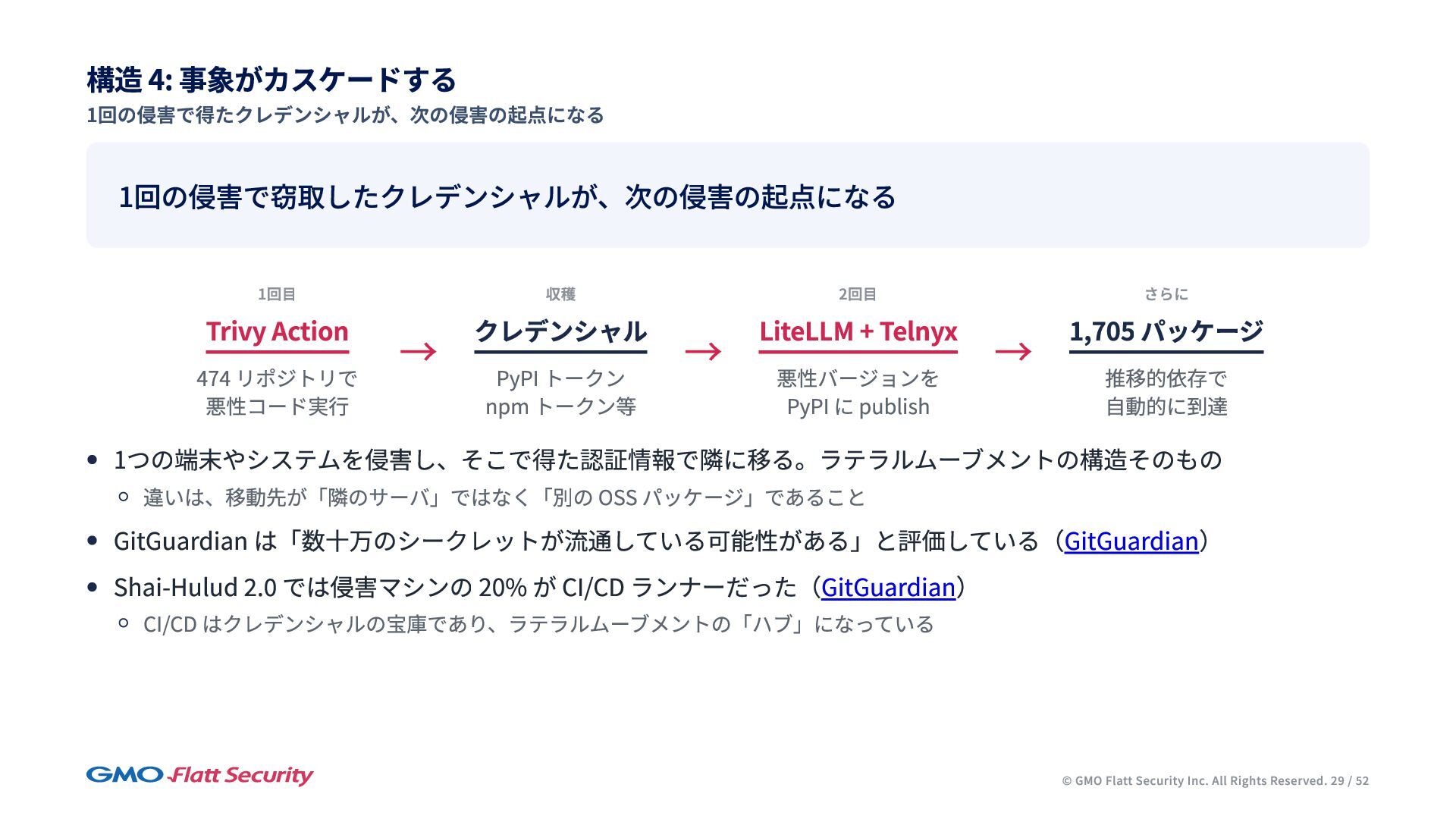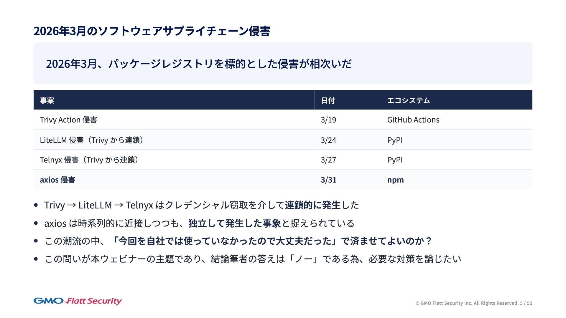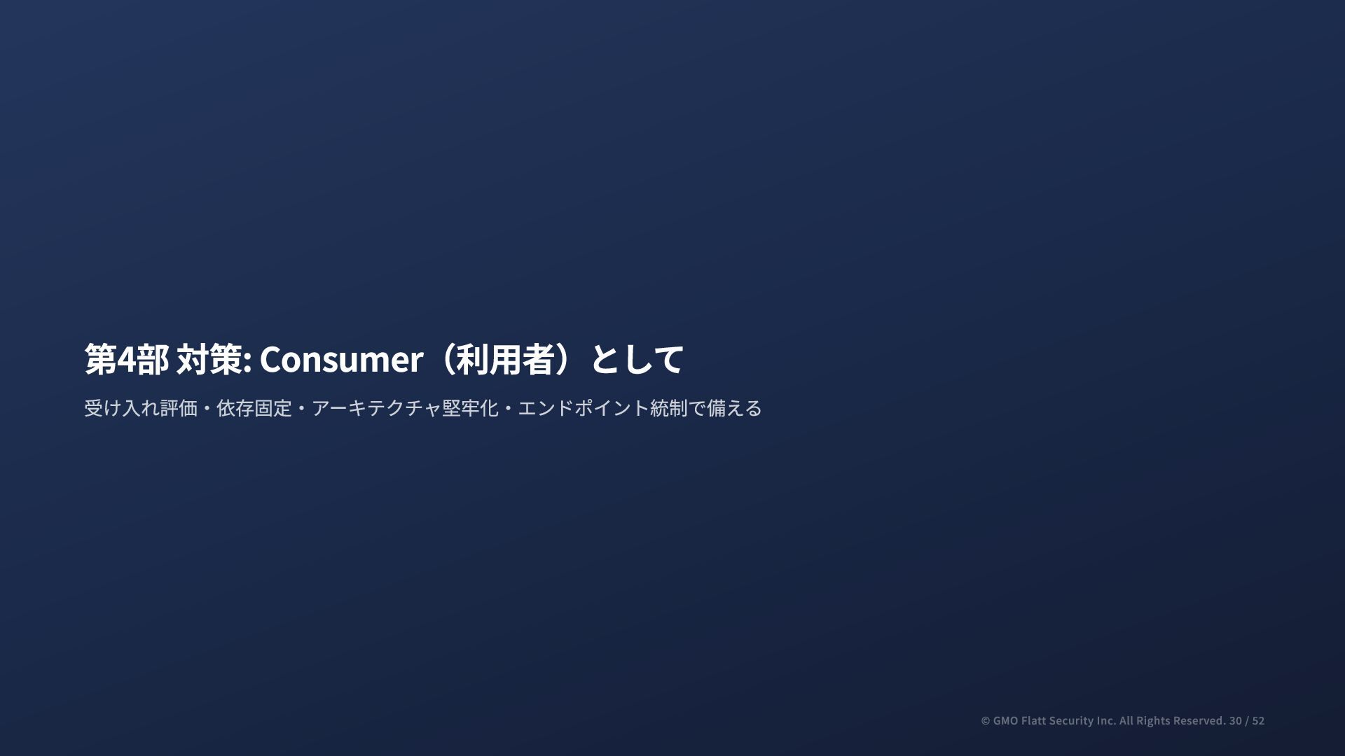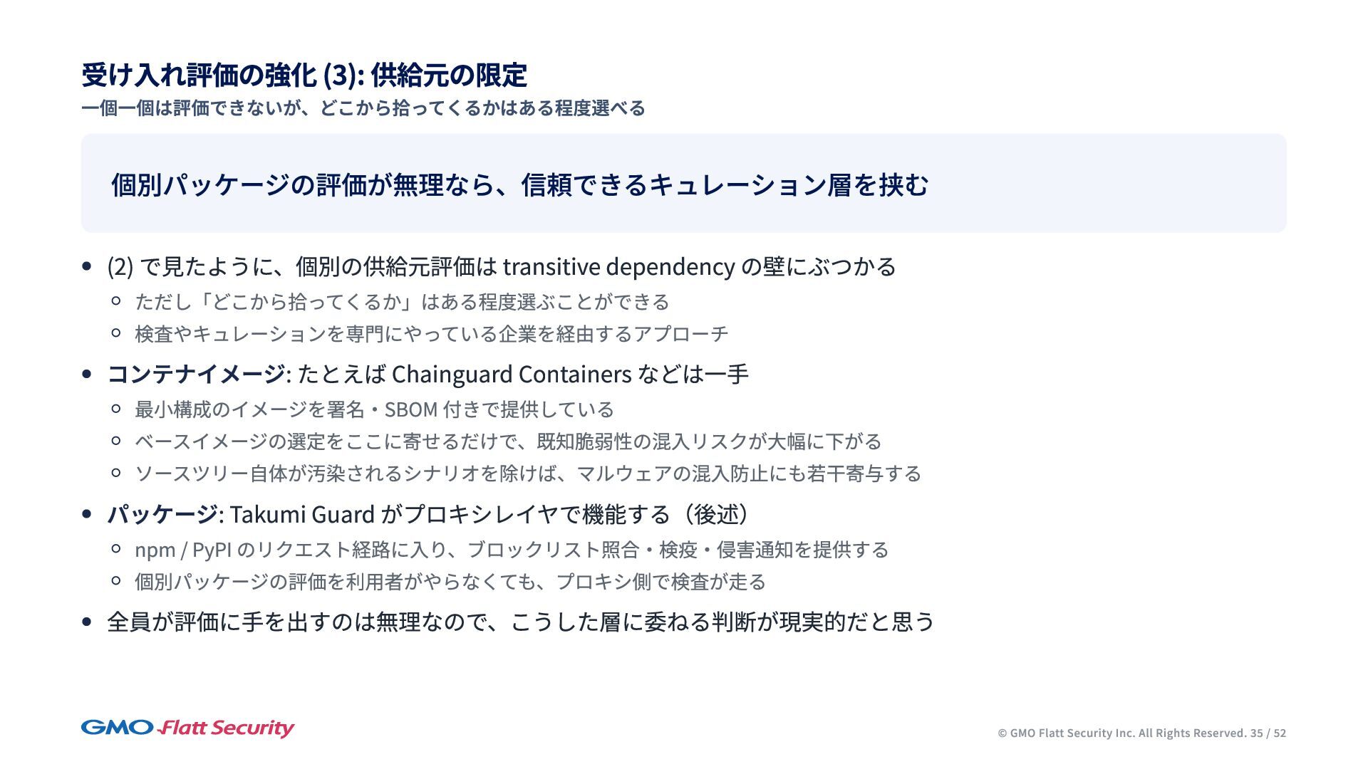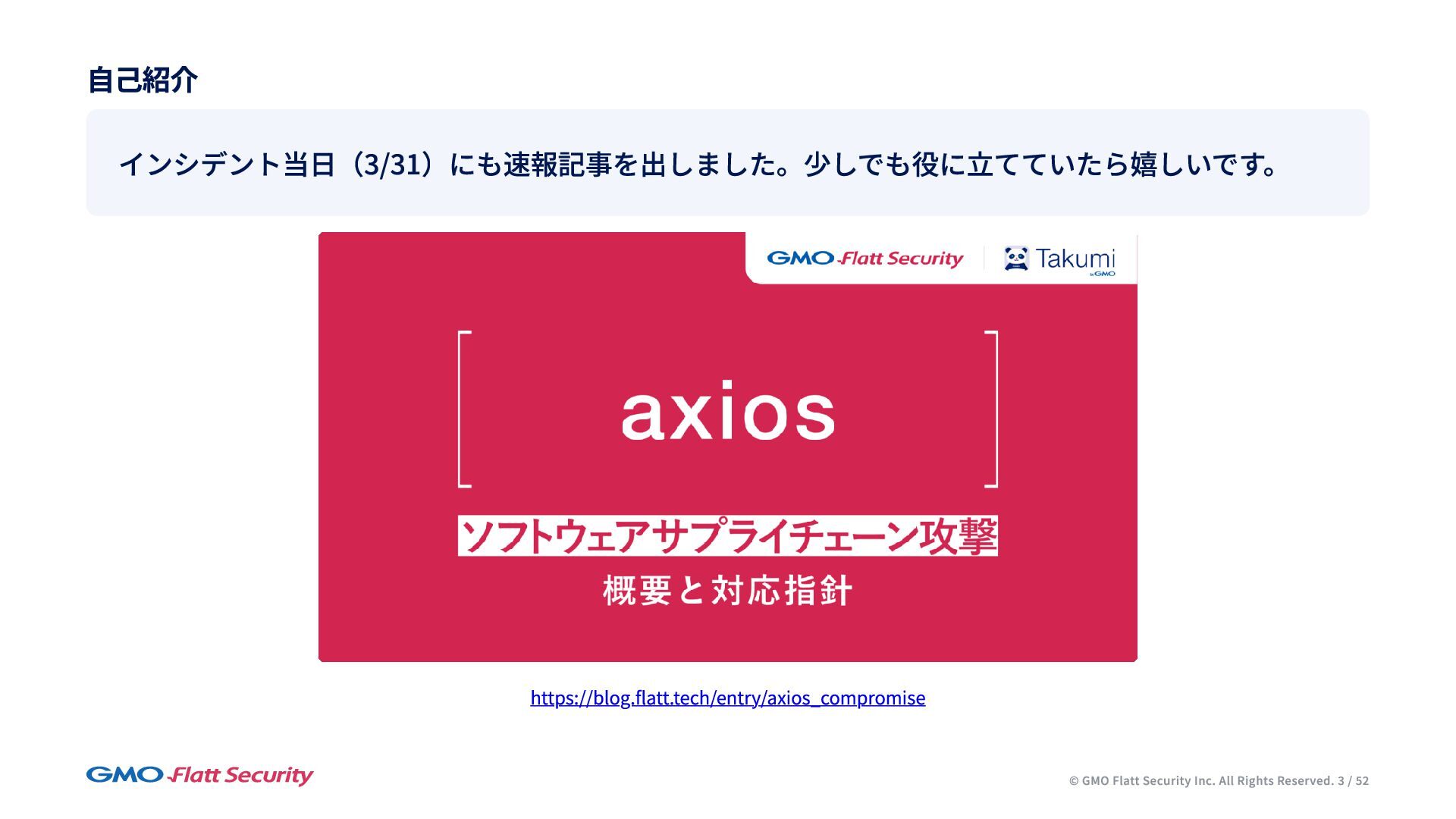 [email protected] ← npm が自動的に解決した(あなたは選んでいない) postinstall: node setup.js ← npm が自動的に実行した npm はパッケージの postinstall スクリプトを install 時に自動実行する 推移的依存のスクリプトも実行される。gatsby を入れただけで axios の postinstall が走る 構造的には、これさえ無ければ、攻撃のステップは 1 つ増える(→ 攻撃者にとって面倒が増える) 実際、pnpm v10~ はこの挙動をデフォルトでブロックする方向に転じている 許可リスト( allowBuilds )に明示的に登録したパッケージのみ実行を許可する挙動をとる Bun も Top 500 パッケージの許可リスト + trustedDependencies で制御しているよう 構造 1: install 時のコード自動実行の仕組みがある © GMO Flatt Security Inc. All Rights Reserved. 23 / 52
