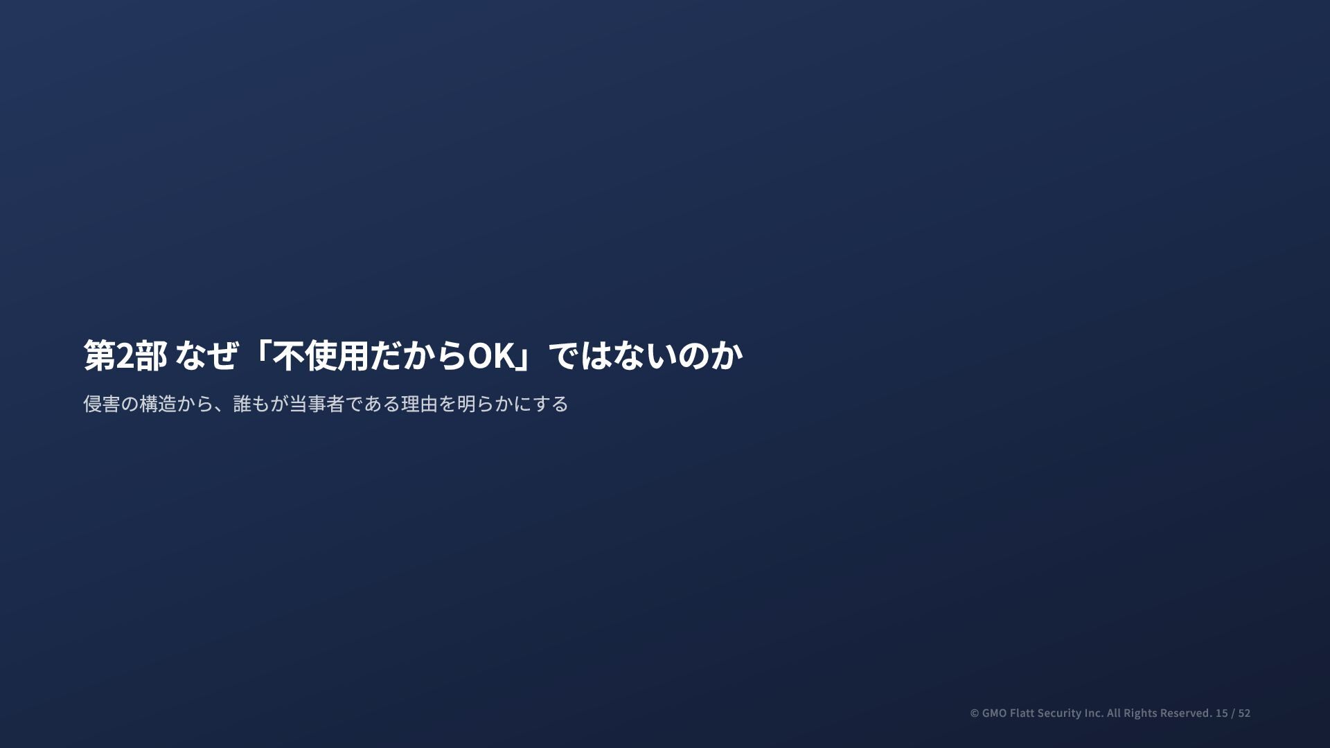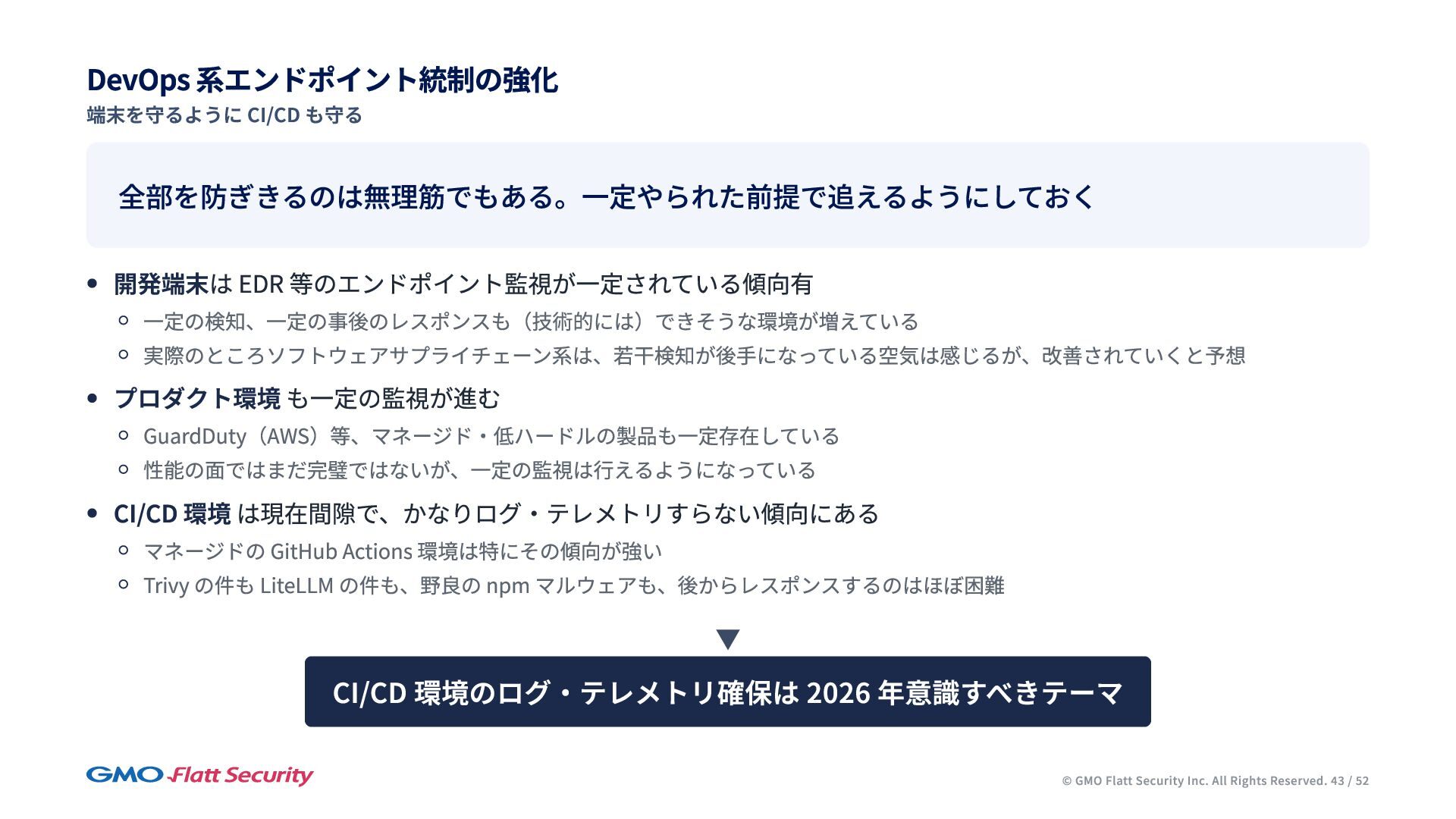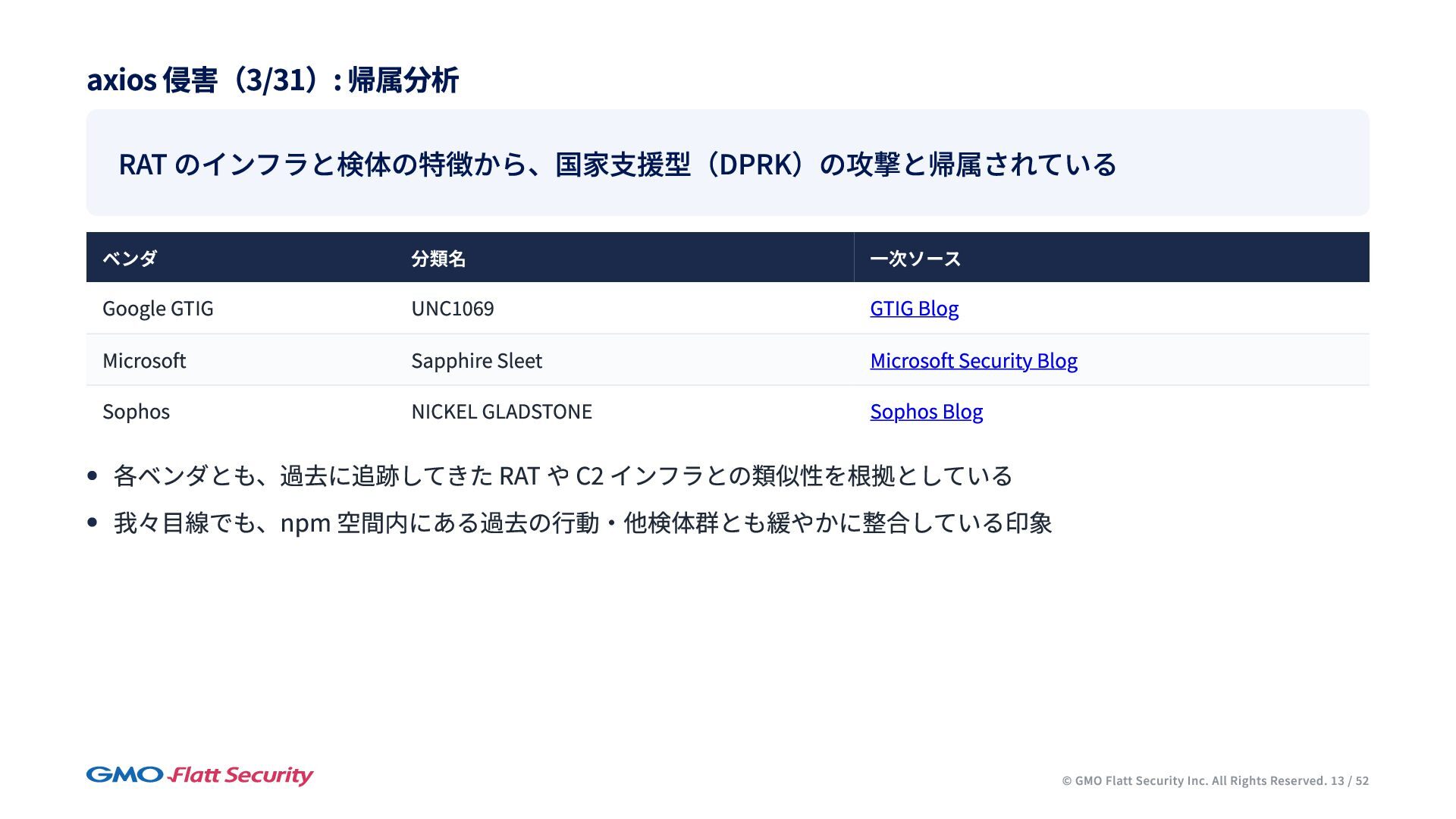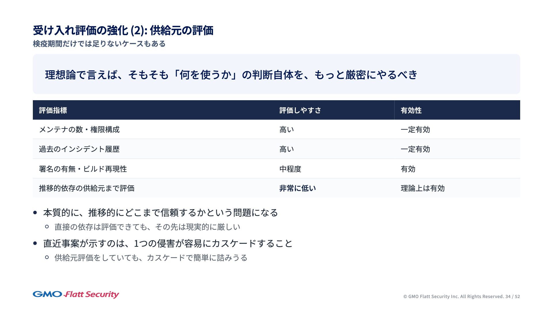 [email protected] ← npm が自動的に解決した(あなたは選んでいない) postinstall: node setup.js ← npm が自動的に実行した npm はパッケージの postinstall スクリプトを install 時に自動実行する 推移的依存のスクリプトも実行される。gatsby を入れただけで axios の postinstall が走る 構造的には、これさえ無ければ、攻撃のステップは 1 つ増える(→ 攻撃者にとって面倒が増える) 実際、pnpm v10~ はこの挙動をデフォルトでブロックする方向に転じている 許可リスト( allowBuilds )に明示的に登録したパッケージのみ実行を許可する挙動をとる Bun も Top 500 パッケージの許可リスト + trustedDependencies で制御しているよう 構造 1: install 時のコード自動実行の仕組みがある © GMO Flatt Security Inc. All Rights Reserved. 23 / 52