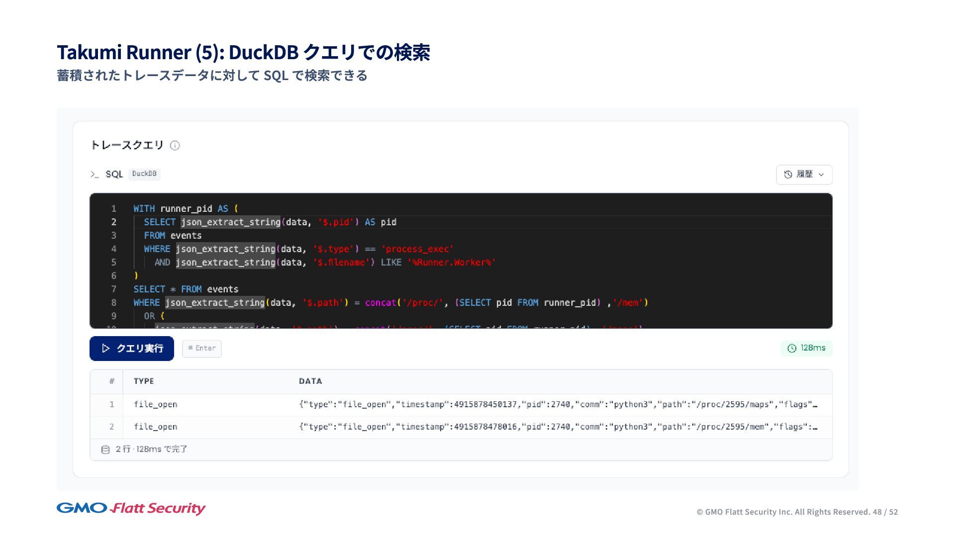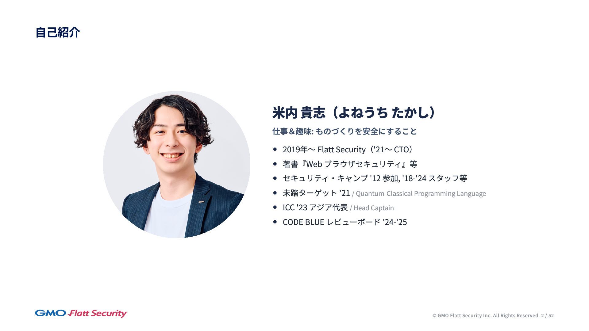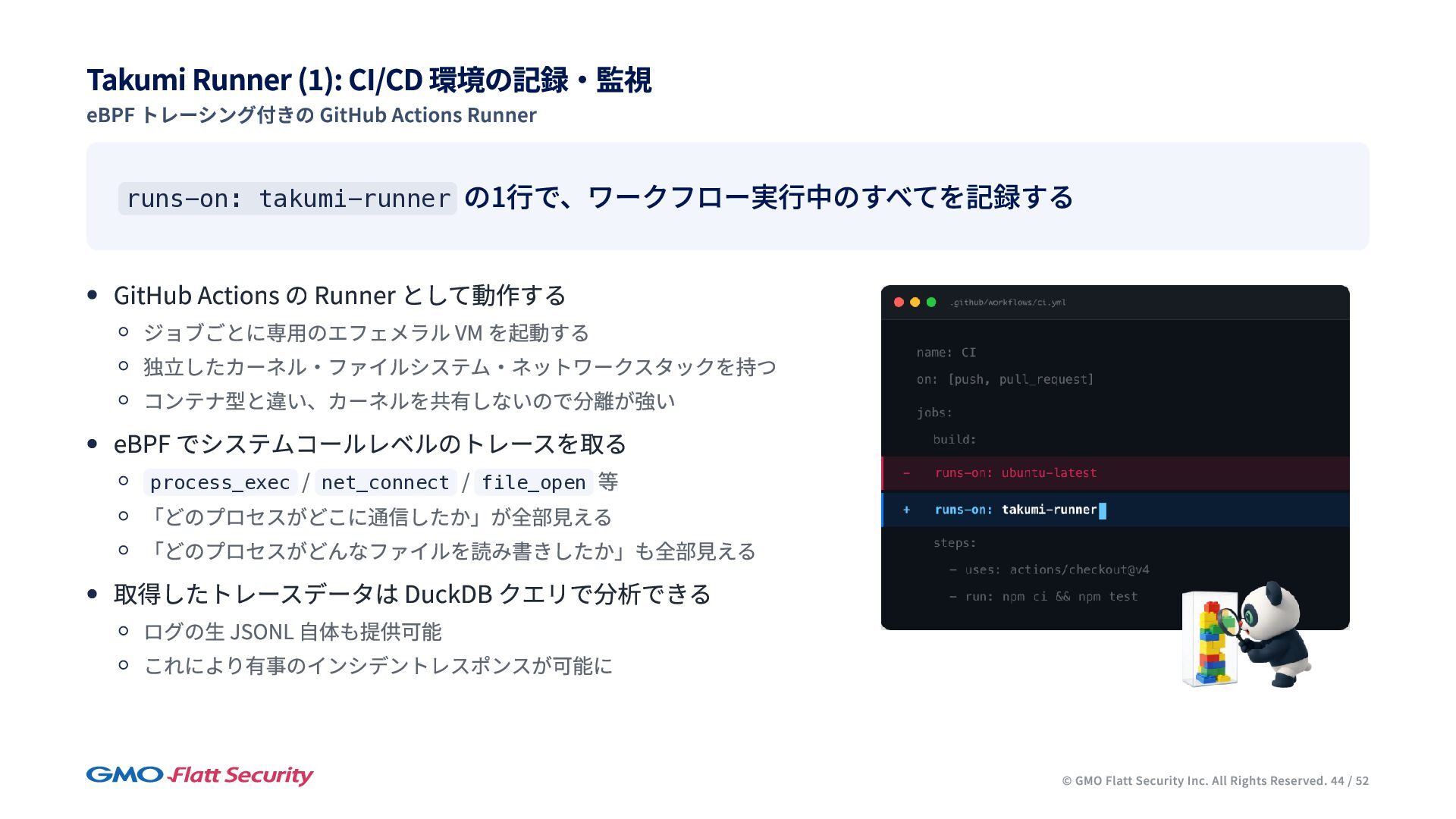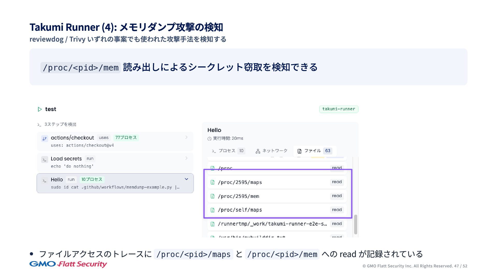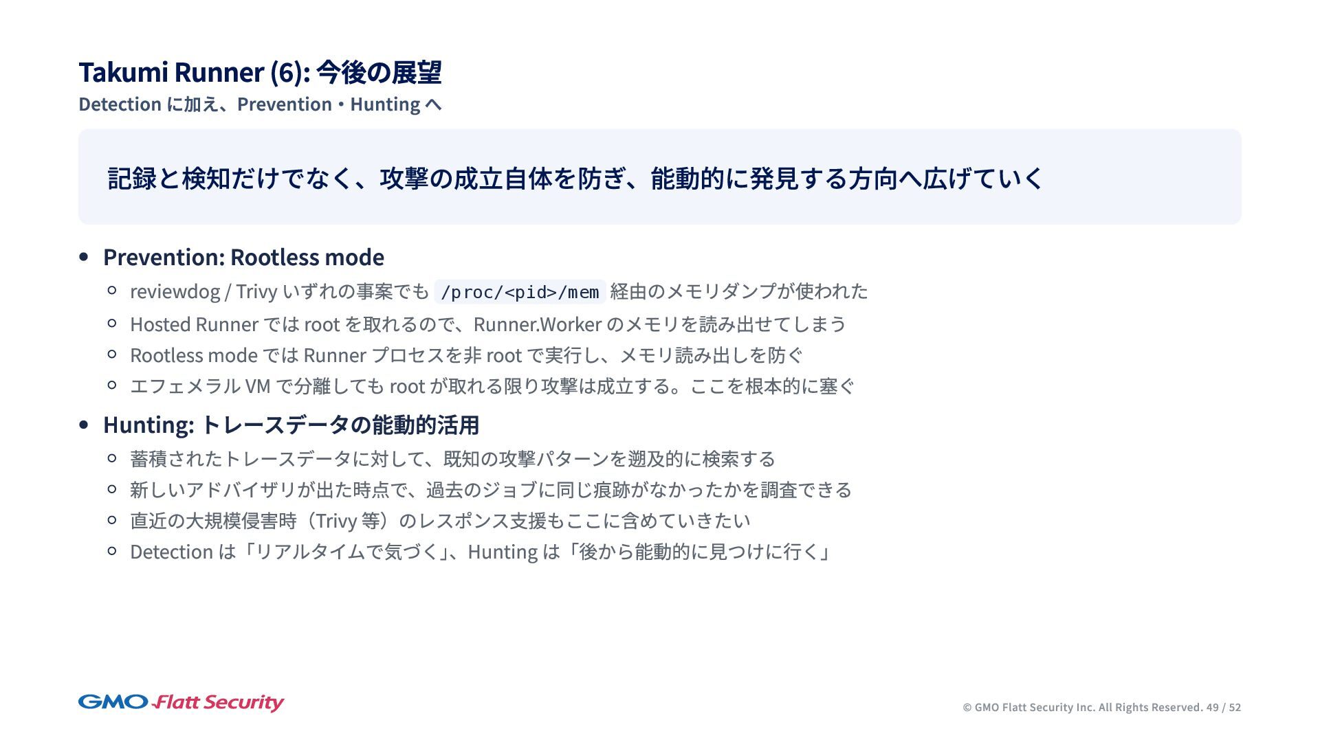 [email protected] ← npm が自動的に解決した(あなたは選んでいない) postinstall: node setup.js ← npm が自動的に実行した npm はパッケージの postinstall スクリプトを install 時に自動実行する 推移的依存のスクリプトも実行される。gatsby を入れただけで axios の postinstall が走る 構造的には、これさえ無ければ、攻撃のステップは 1 つ増える(→ 攻撃者にとって面倒が増える) 実際、pnpm v10~ はこの挙動をデフォルトでブロックする方向に転じている 許可リスト( allowBuilds )に明示的に登録したパッケージのみ実行を許可する挙動をとる Bun も Top 500 パッケージの許可リスト + trustedDependencies で制御しているよう 構造 1: install 時のコード自動実行の仕組みがある © GMO Flatt Security Inc. All Rights Reserved. 23 / 52
