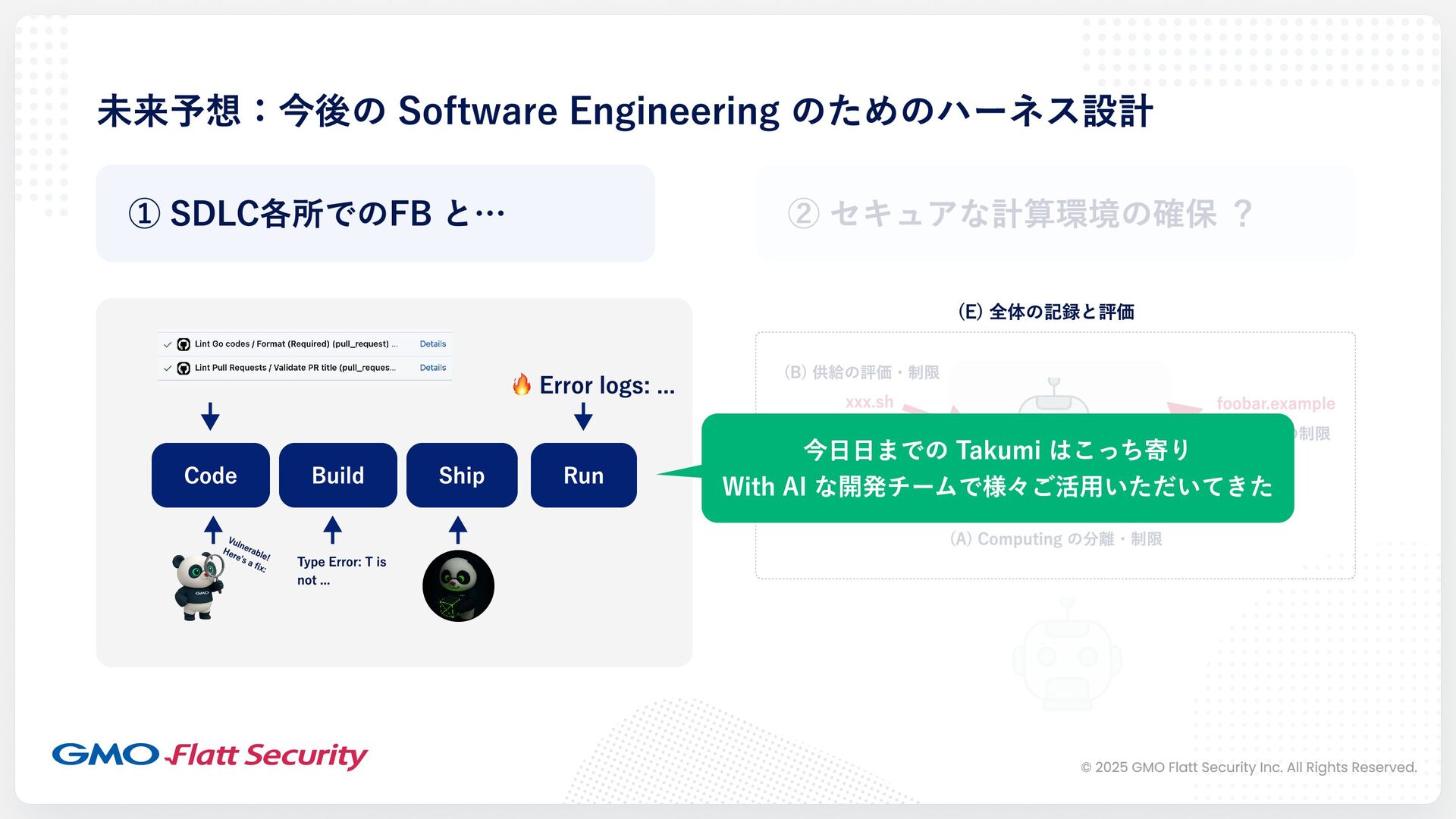 (B) 供給の評価・制限 xxx.sh (E) 全体の記録と評価 🔥 Error logs: ... foobar.example 今日日までの Takumi はこっち寄り With AI な開発チームで様々ご活用いただいてきた (D) 行使の制限 (C) 送信の制限 Code Build Ship Run (A) Computing の分離・制限 Vulnerable! Here’s a fix: Type Error: T is not ... © 2025 GMO Flatt Security Inc. All Rights Reserved.