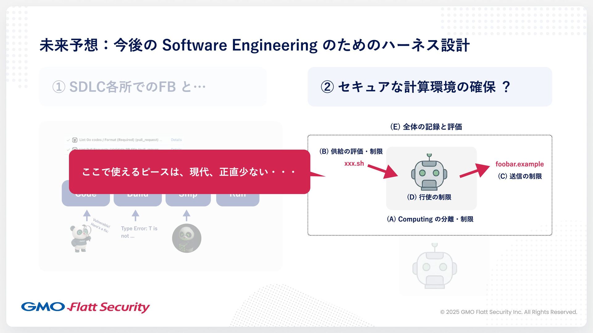 (B) 供給の評価・制限 xxx.sh (E) 全体の記録と評価 🔥 Error logs: ... ここで使えるピースは、現代、正直少ない・・・ Code Build Ship Run foobar.example (C) 送信の制限 (D) 行使の制限 (A) Computing の分離・制限 Vulnerable! Here’s a fix: Type Error: T is not ... © 2025 GMO Flatt Security Inc. All Rights Reserved.