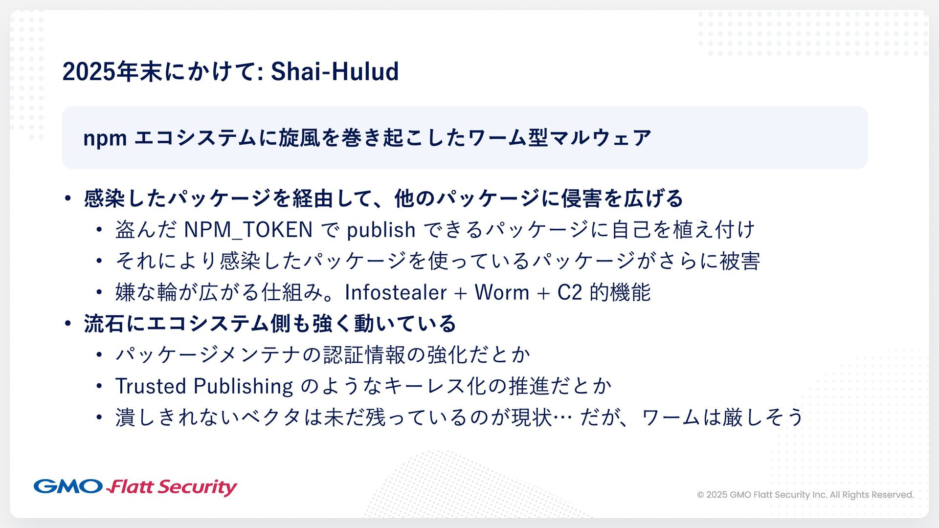 2025年末にかけて: Shai-Hulud npm エコシステムに旋風を巻き起こしたワーム型マルウェア 感染したパッケージを経由して、他のパッケージに侵害を広げる 盗んだ NPM_TOKEN で publish できるパッケージに自己を植え付け