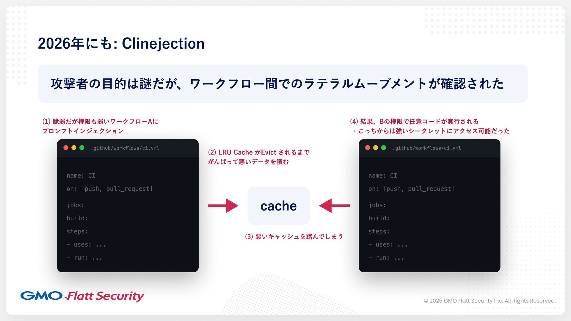 こっちからは強いシークレットにアクセス可能だった .github/workflows/ci.yml (2) LRU Cache がEvict されるまで がんばって悪いデータを積む name: CI on: [push, pull_request] name: CI on: [push, pull_request] cache (3) 悪いキャッシュを踏んでしまう jobs: build: steps: - uses: ... - run: ... jobs: build: steps: - uses: ... - run: ... © 2025 GMO Flatt Security Inc. All Rights Reserved.