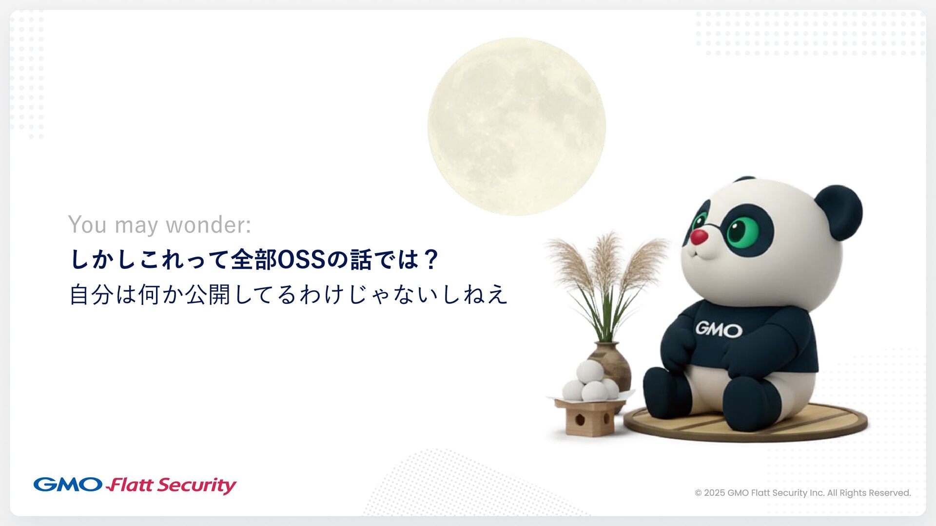 You may wonder: しかしこれって全部OSSの話では? 自分は何か公開してるわけじゃないしねえ © 2025 GMO Flatt Security