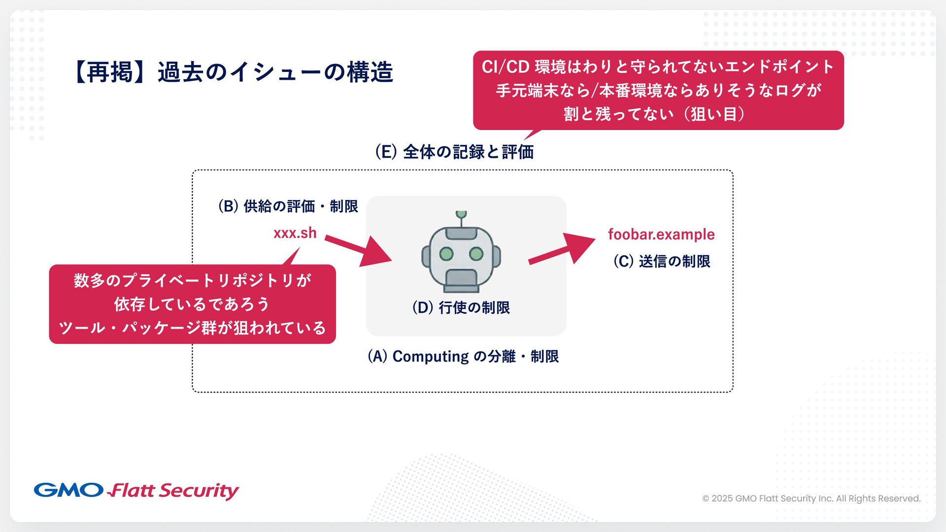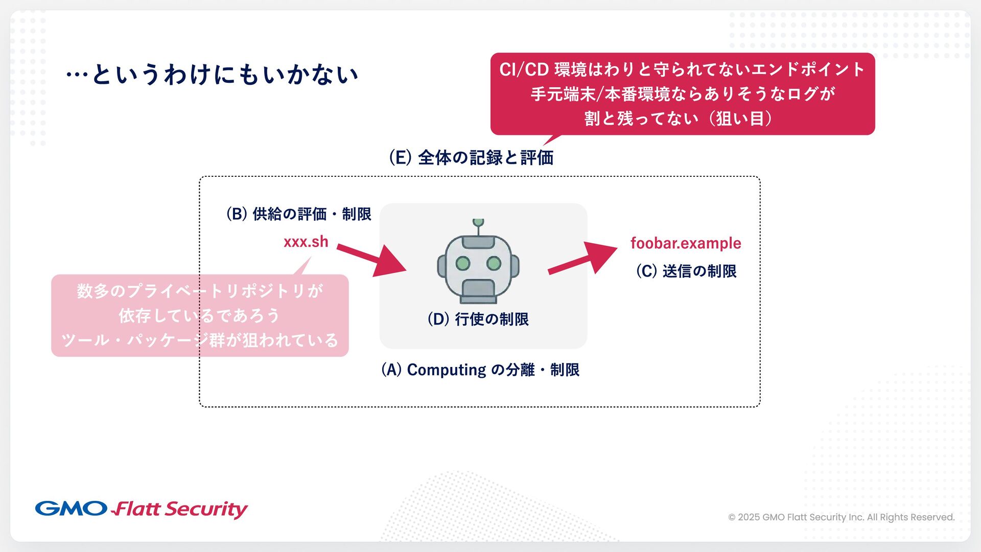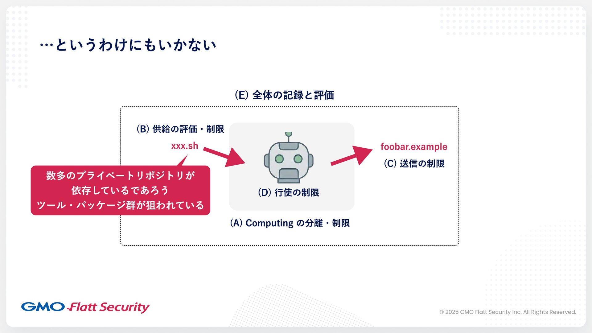 (E) 全体の記録と評価 foobar.example (C) 送信の制限 数多のプライベートリポジトリが 依存しているであろう ツール・パッケージ群が狙われている 入れない (D) 行使の制限 (A) Computing の分離・制限 © 2025 GMO Flatt Security Inc. All Rights Reserved.