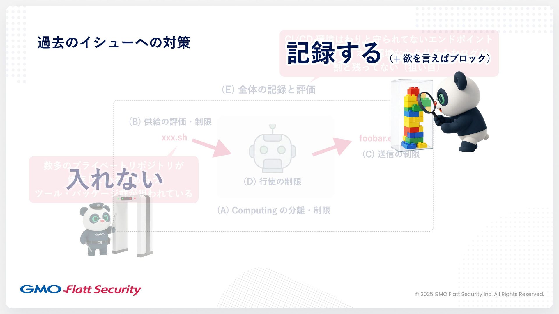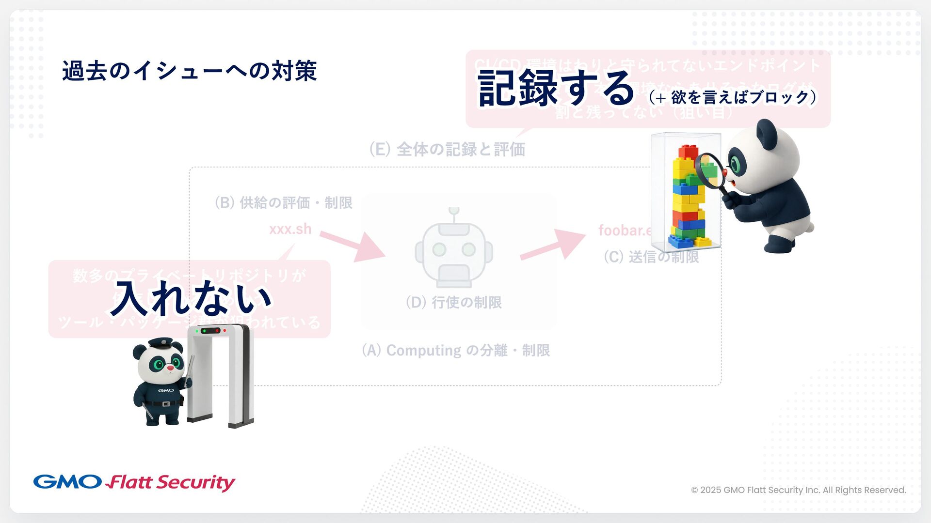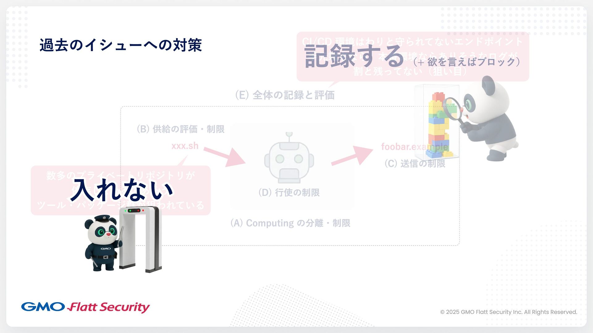 (E) 全体の記録と評価 foobar.example (C) 送信の制限 数多のプライベートリポジトリが 依存しているであろう ツール・パッケージ群が狙われている 入れない (D) 行使の制限 (A) Computing の分離・制限 © 2025 GMO Flatt Security Inc. All Rights Reserved.