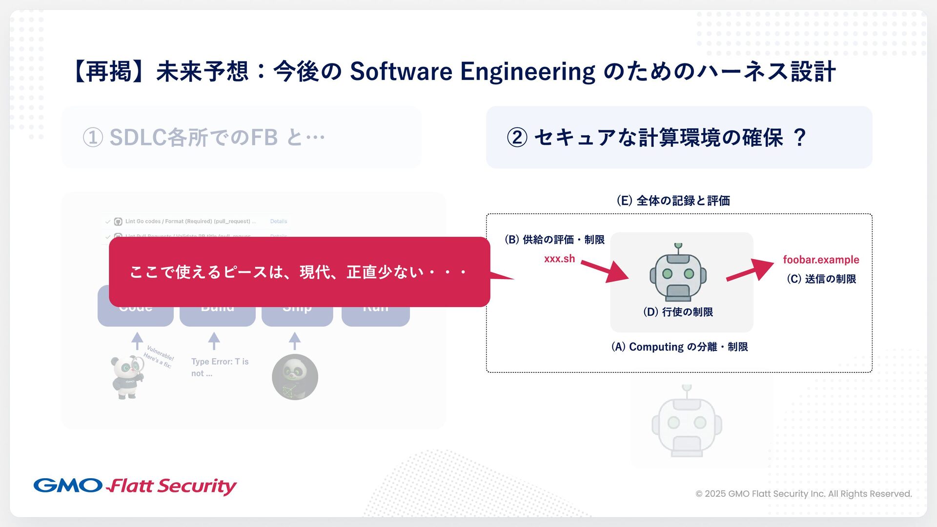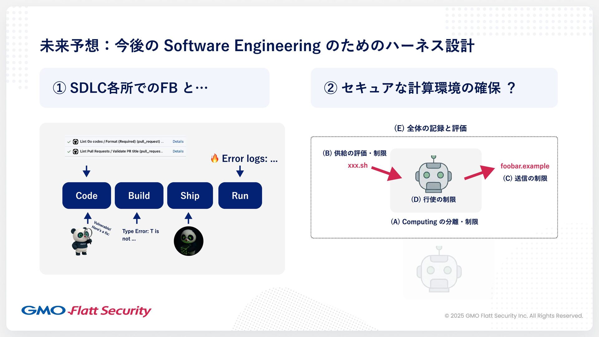 【再掲】未来予想:今後の Software Engineering のためのハーネス設計 ① SDLC各所でのFB と… ② セキュアな計算環境の確保 ?