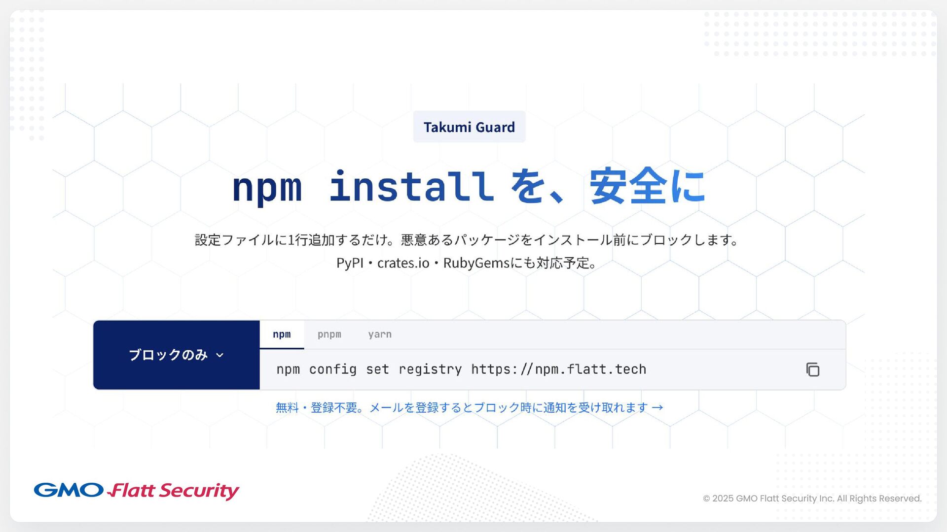 マルウェアパッケージの インストールをブロックする Takumi Guard 提供開始 © 2025 GMO Flatt Security