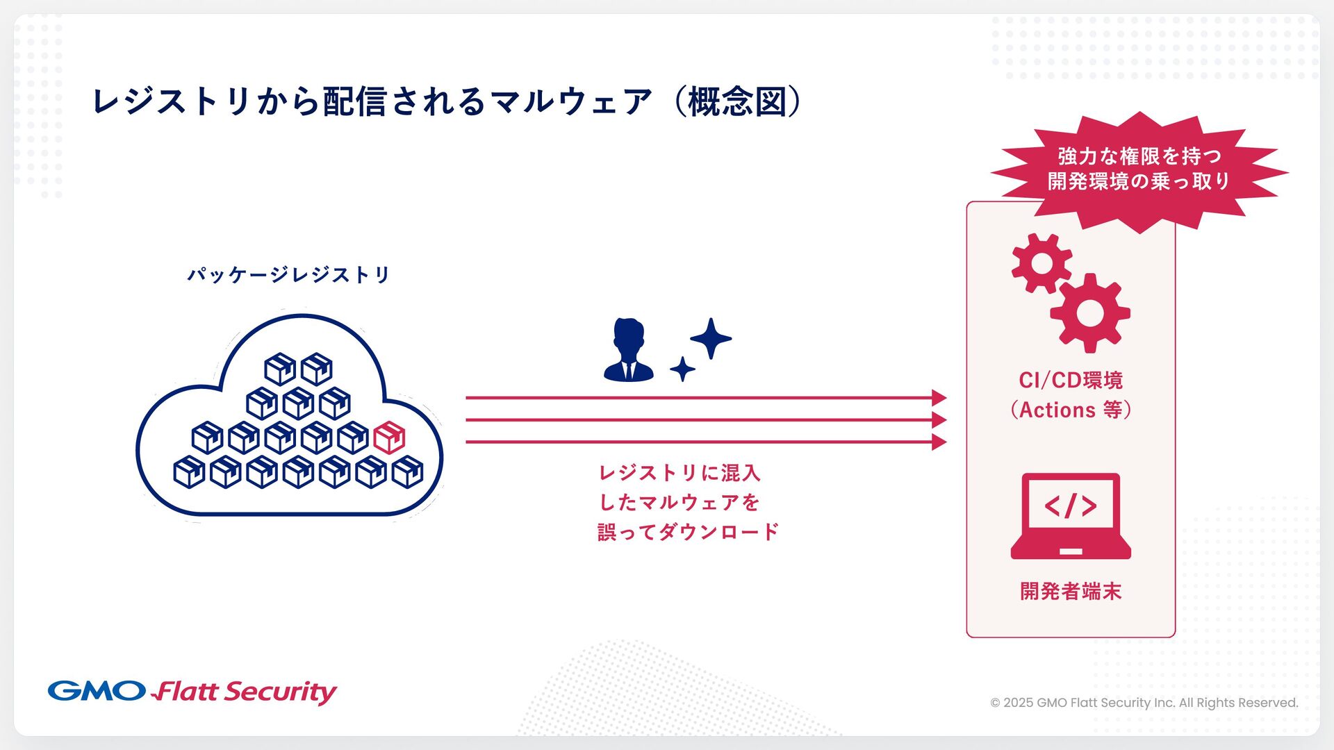 レジストリから配信されるマルウェア(概念図) パッケージレジストリ レジストリに混入 したマルウェアを 誤ってダウンロード 強力な権限を持つ 開発環境の乗っ取り CI/CD環境 (Actions 等)