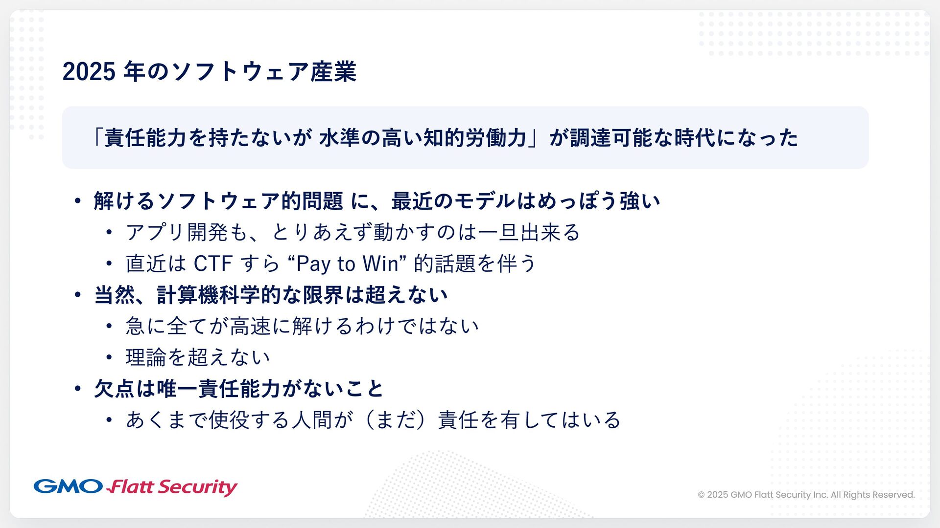 “Pay to Win” 的話題を伴う 当然、計算機科学的な限界は超えない 急に全てが高速に解けるわけではない 理論を超えない 欠点は唯一責任能力がないこと あくまで使役する人間が(まだ)責任を有してはいる © 2025 GMO Flatt Security Inc. All Rights Reserved.