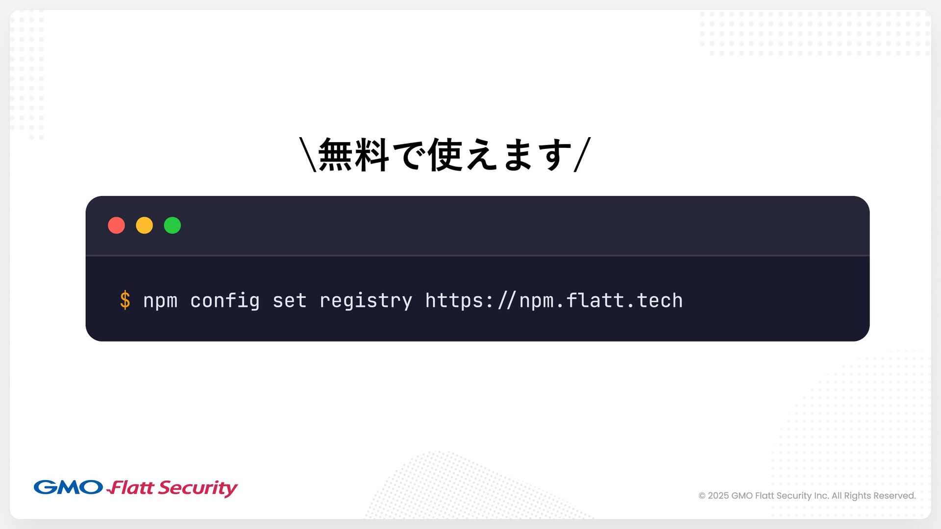 \無料で使えます/ $ npm config set registry https://npm.flatt.tech © 2025 GMO