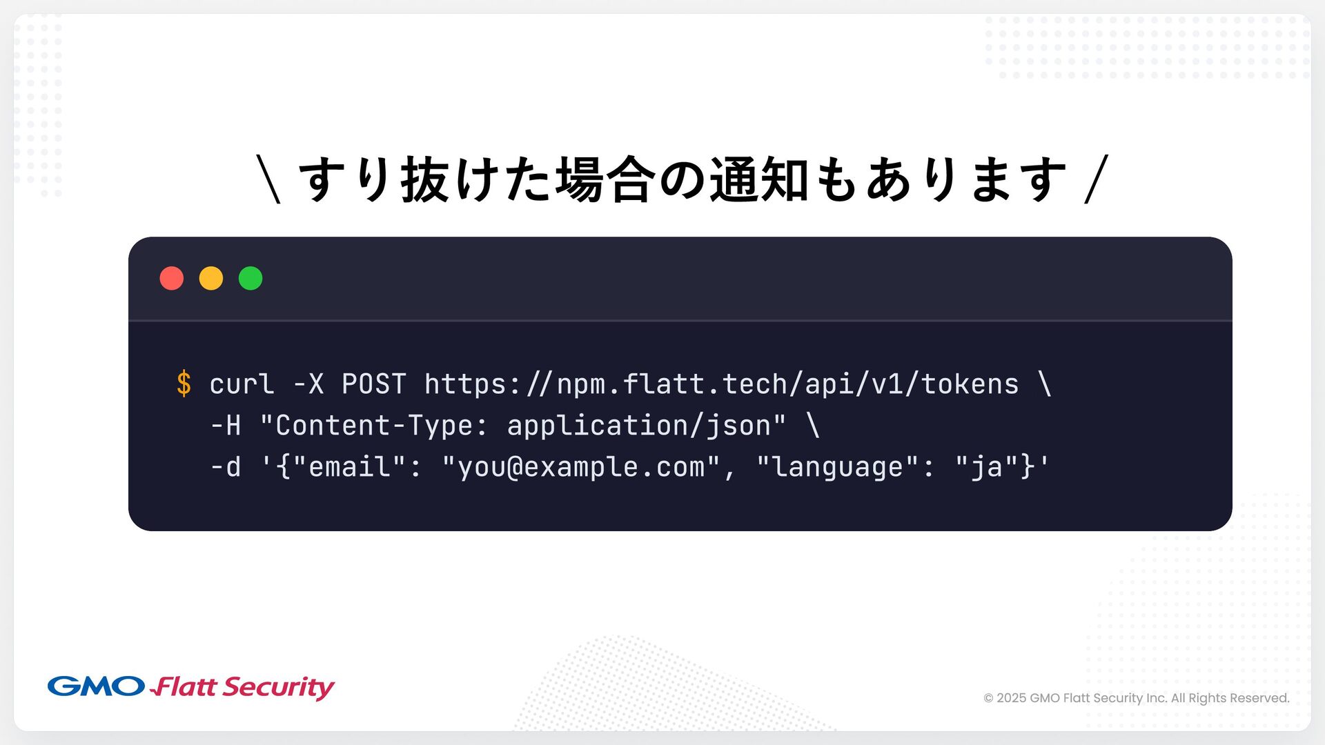 \ すり抜けた場合の通知もあります / $ curl -X POST https://npm.flatt.tech/api/v1/tokens \ -H