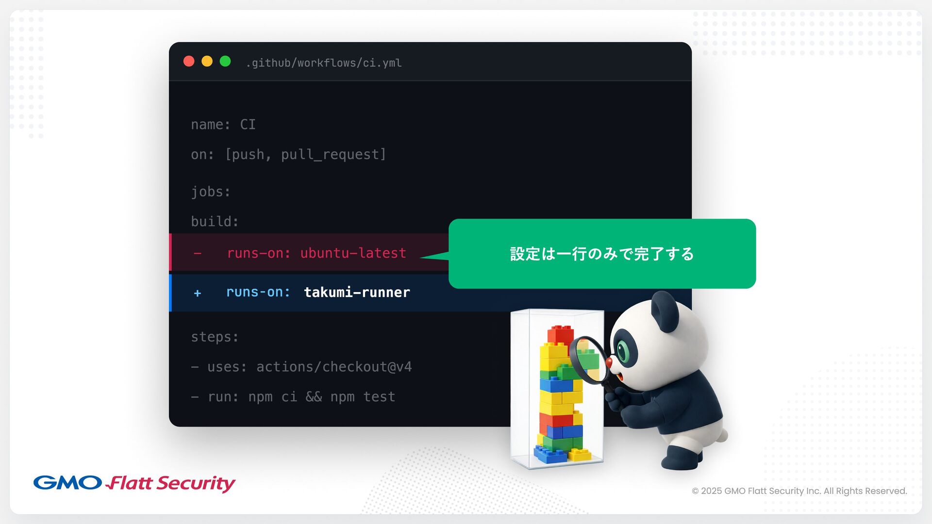 ubuntu-latest + runs-on: takumi-runner steps: - uses: actions/checkout@v4 - run: npm ci && npm test 設定は一行のみで完了する © 2025 GMO Flatt Security Inc. All Rights Reserved.