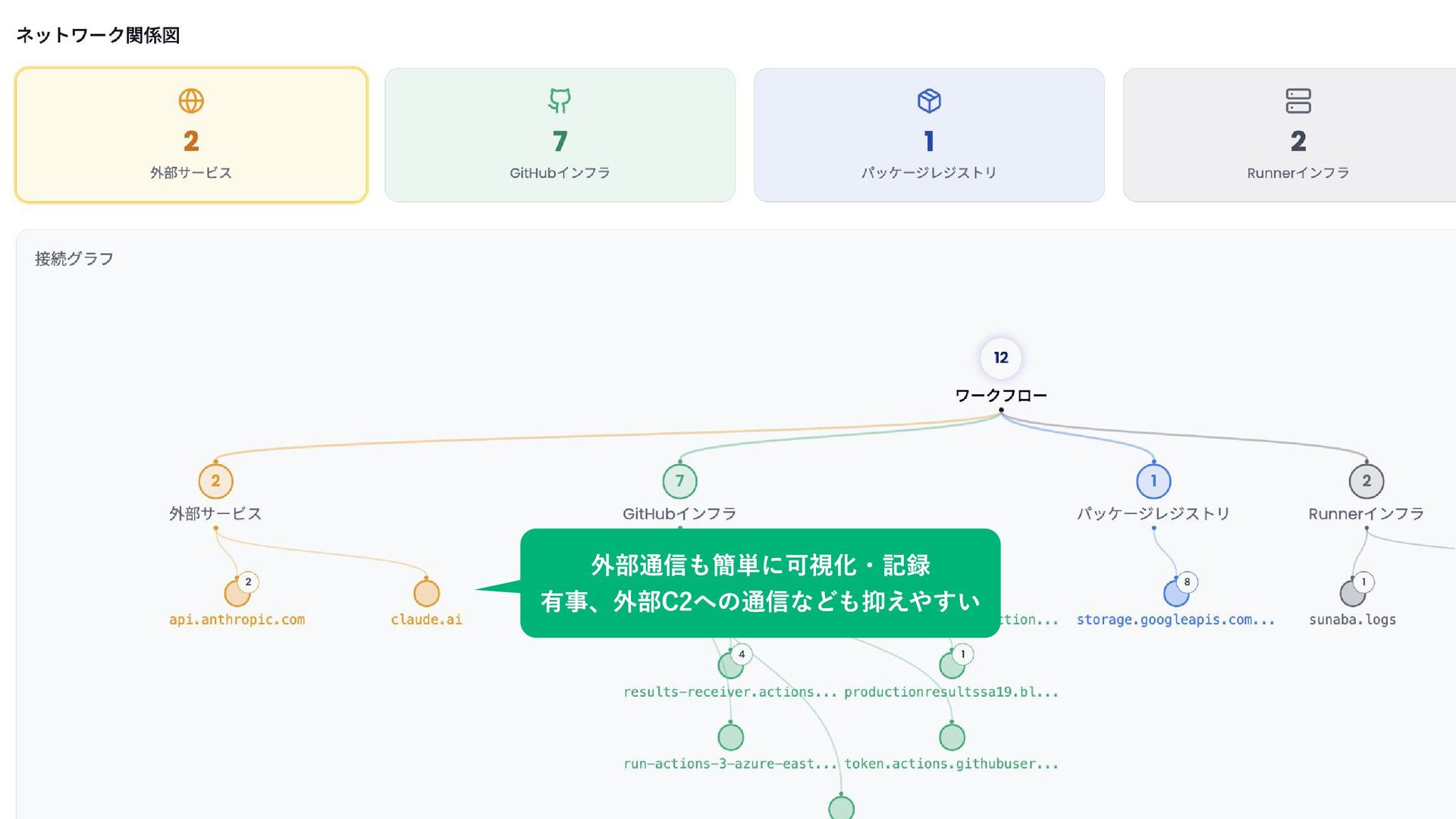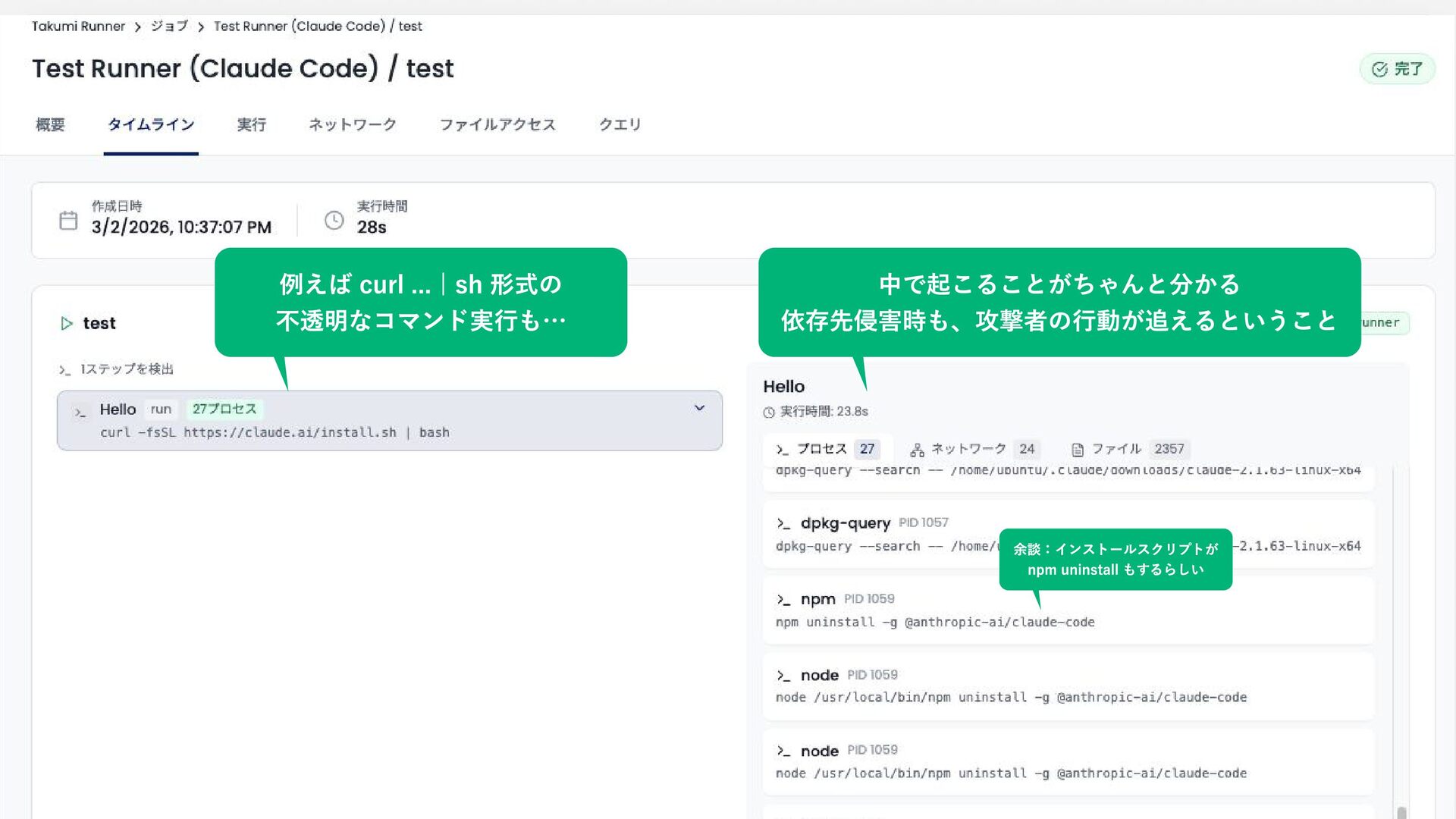 例えば curl ... | sh 形式の 不透明なコマンド実行も… 中で起こることがちゃんと分かる 依存先侵害時も、攻撃者の行動が追えるということ 余談:インストールスクリプトが