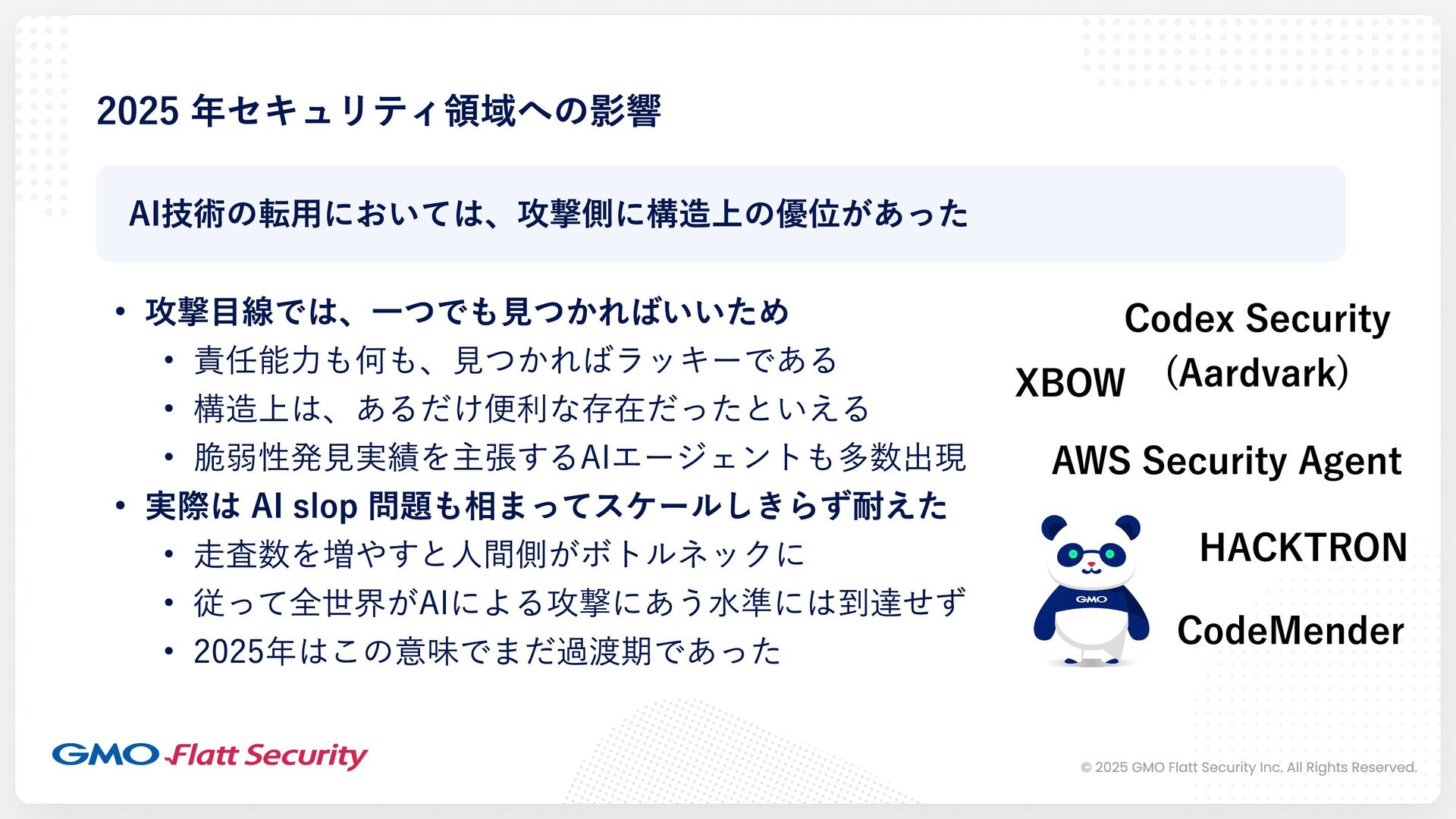 slop 問題も相まってスケールしきらず耐えた 走査数を増やすと人間側がボトルネックに 従って全世界がAIによる攻撃にあう水準には到達せず 2025年はこの意味でまだ過渡期であった XBOW Codex Security (Aardvark) AWS Security Agent HACKTRON CodeMender © 2025 GMO Flatt Security Inc. All Rights Reserved.