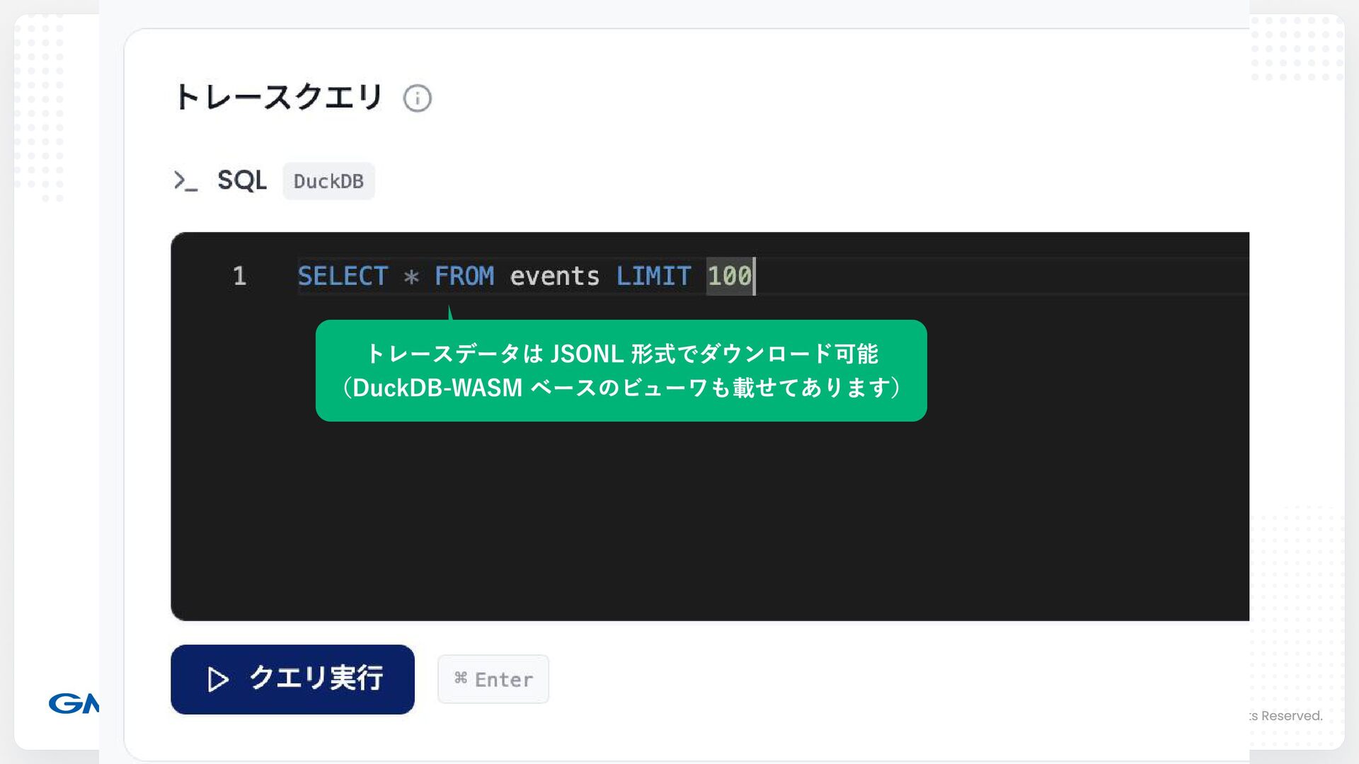 トレースデータは JSONL 形式でダウンロード可能 (DuckDB-WASM ベースのビューワも載せてあります) © 2025 GMO Flatt Security