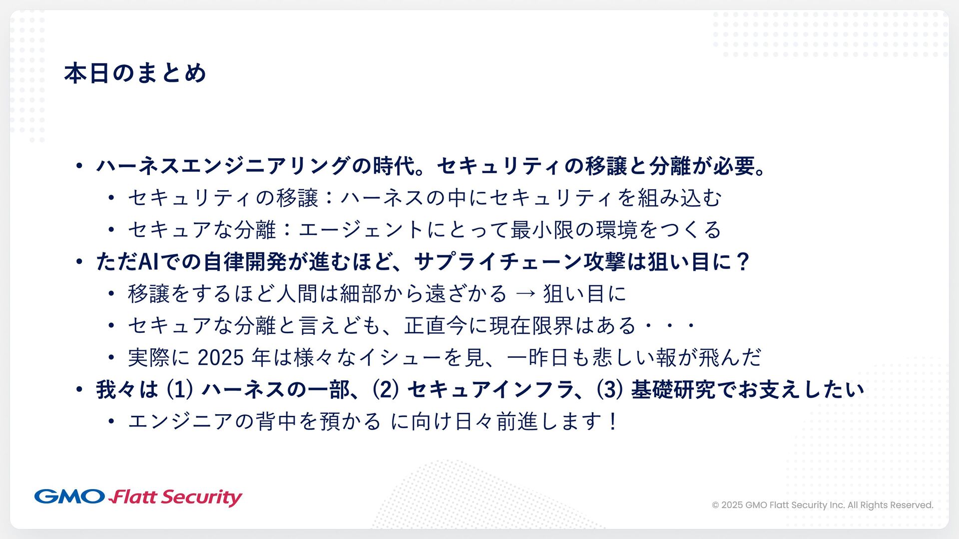 本日のまとめ ハーネスエンジニアリングの時代。セキュリティの移譲と分離が必要。 セキュリティの移譲:ハーネスの中にセキュリティを組み込む セキュアな分離:エージェントにとって最小限の環境をつくる ただAIでの自律開発が進むほど、サプライチェーン攻撃は狙い目に? 移譲をするほど人間は細部から遠ざかる → 狙い目に セキュアな分離と言えども、正直今に現在限界はある・・・ 実際に