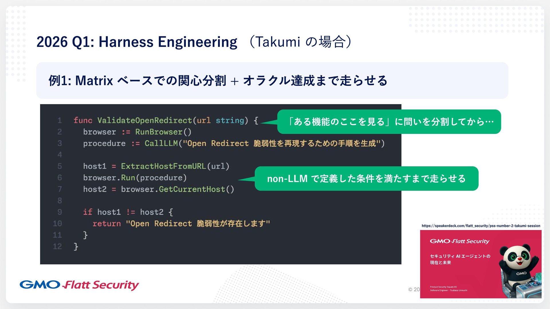 オラクル達成まで走らせる 「ある機能のここを見る」に問いを分割してから… non-LLM で定義した条件を満たすまで走らせる https://speakerdeck.com/flatt_security/pss-number-2-takumi-session © 2025 GMO Flatt Security Inc. All Rights Reserved.