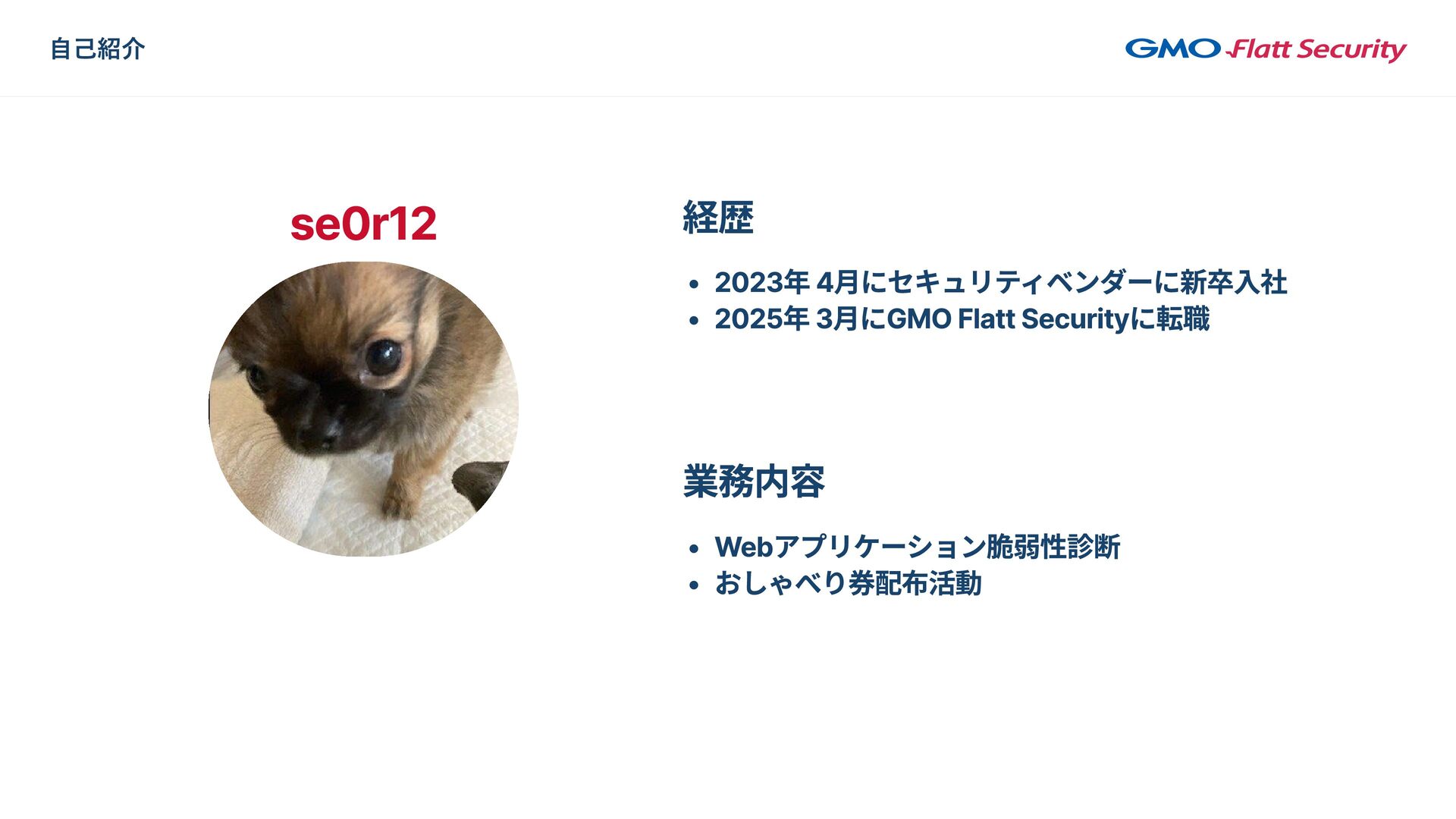 情報科学若手の会・セキュリティ若手の会 春の陣2026 ( https://wakate.connpass.com/event/382858/ ) におけるセキュリティエンジニア・se0r12 ( https://x.com/se0r12__ ) の登壇資料です。
