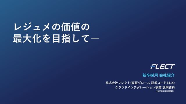 ・ノートPC/社用携帯iPhone貸与 ・退職金制度(企業型確定拠出年金) ・従業員持株会制度 ・慶弔見舞金 ・出産、育児支援制度 →小学校卒業時まで育児介護時短制度可能 健康・衛生 ・インフルエンザ予防接種 ・定期健康診断 ・雇用時検診 ・衛生委員会(毎月実施) スキルアップ ・書籍購入支援制度 (個人所有・電子書籍可・1万円/月) ・資格取得支援制度 (受験料の会社負担・報奨金5〜20万円) ・ランチ勉強会 当社は、社員が働きやすい環境を大切にしています。 福利厚生・社内制度 C u l t u r e & W o r k E n v i r o n m e n t コミュニケーション ・Go to Lunch ・エンゲージメント測定(wevox) ・サークル活動支援制度 (ボルタリング、ボードゲーム、ゴルフ、ダーツ、麻雀など) イベント ・4月全体会 ・経営報告会(四半期)・フレクトNight(LT)