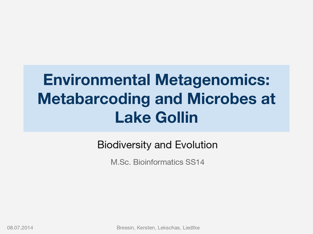 detected with Blast (SILVA) ◦ Same with SINA (online) ◦ Sub sampling may be problematic ◦ too specific classification • Bacteria found although eucaryotic primer • Pipeline (without MEGAN) at https://bitbucket.org/flekschas/biodivex2