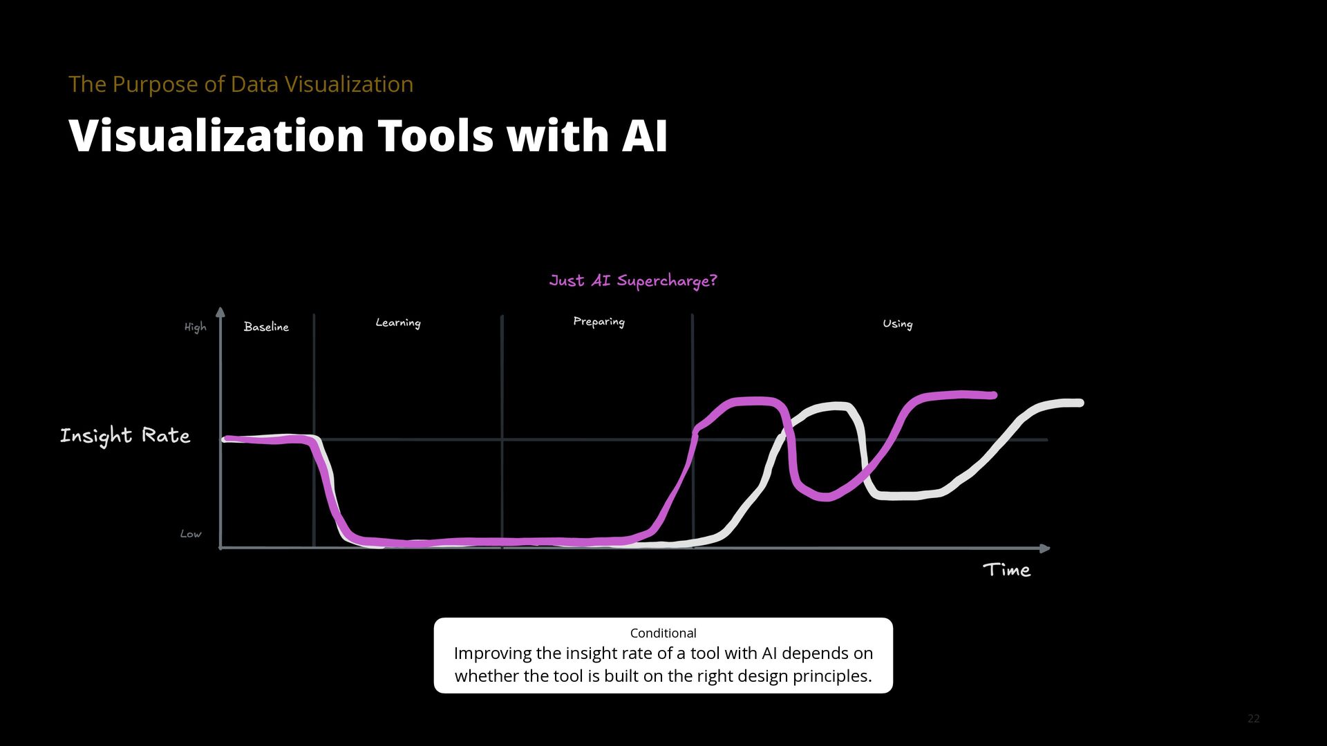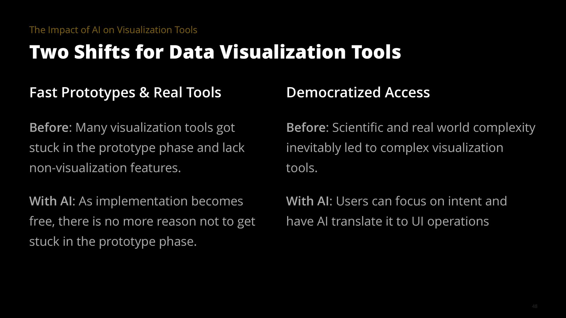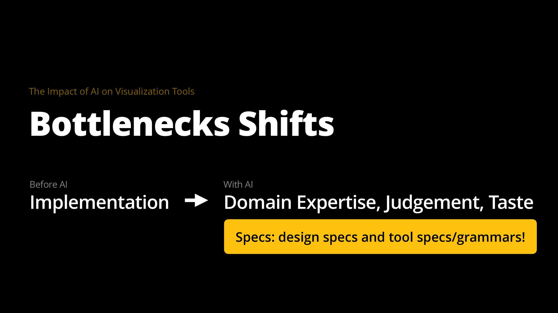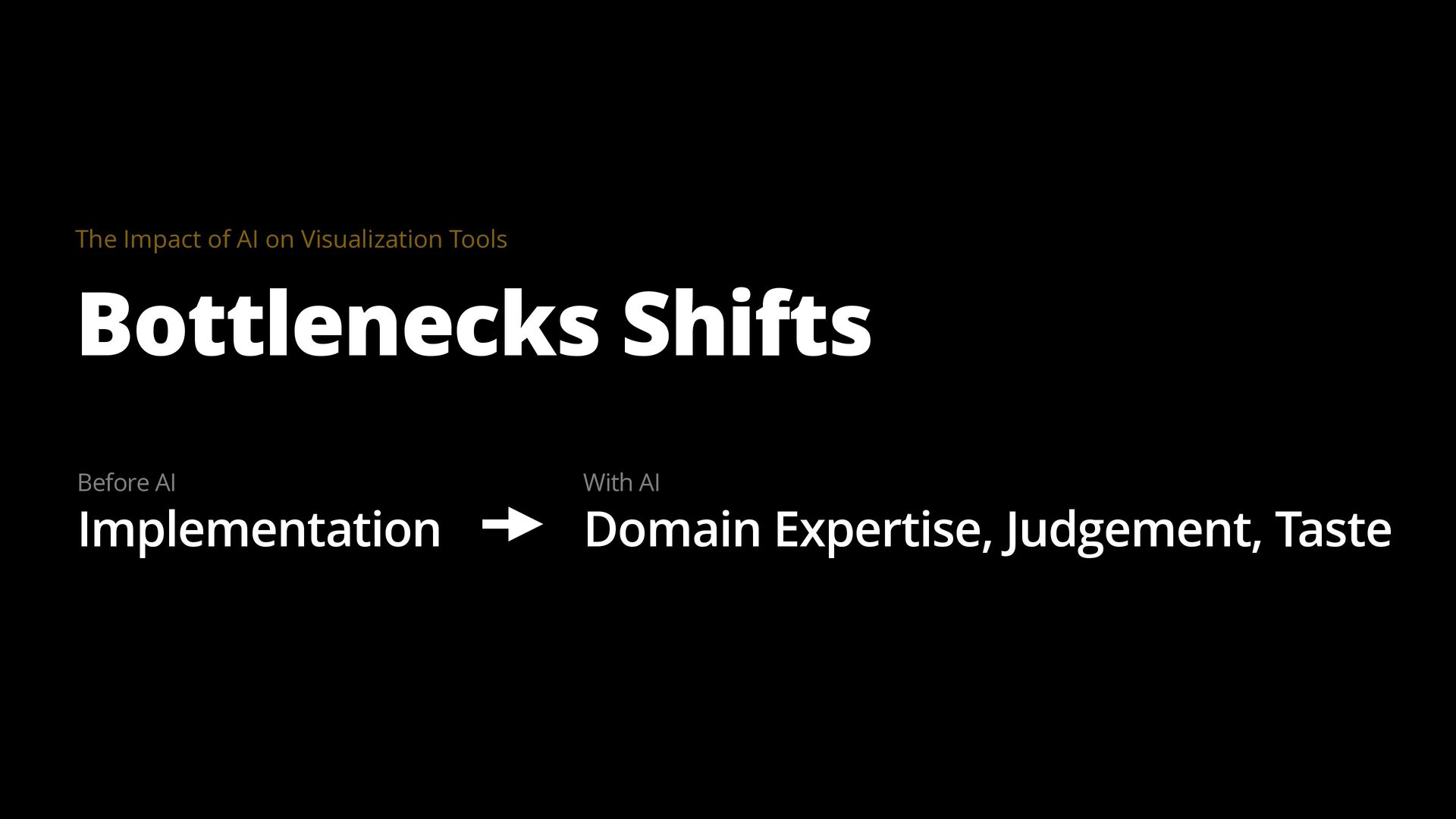 The goal of a visualization tool is to help users gain insights faster. Yet many tools have had limited impact. The learning curve is too high and the most meaningful insights are often hidden in the details, for example, in how data was collected, cleaned, and analyzed. AI is changing this equation by collapsing implementation time, lowering learning curves, and surfacing contextual details that make visualizations truly informative.