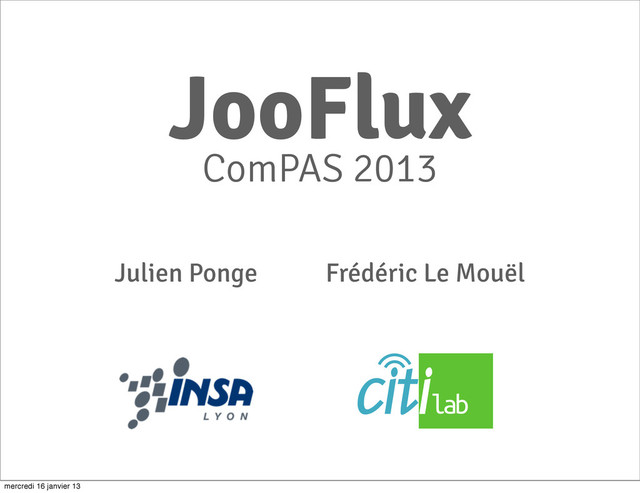 Call site JMX agent JooFlux bootstraper Modified bytecode Registry Target method combinators Load time action Run time action Original bytecode JVM agent 1 2 3 4 mercredi 16 janvier 13