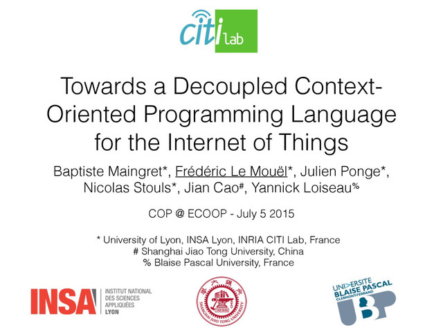 of Things Baptiste Maingret*, Frédéric Le Mouël*, Julien Ponge*, Nicolas Stouls*, Jian Cao#, Yannick Loiseau% * University of Lyon, INSA Lyon, INRIA CITI Lab, France # Shanghai Jiao Tong University, China % Blaise Pascal University, France COP @ ECOOP - July 5 2015