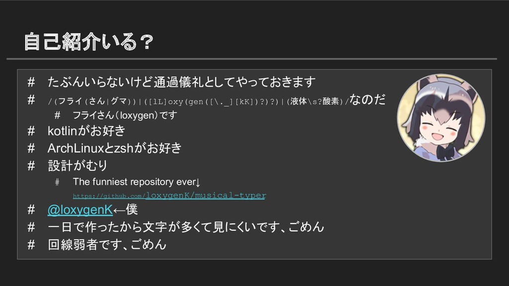 自己紹介いる? # たぶんいらないけど通過儀礼としてやっておきます # /(フライ(さん|グマ))|([lL]oxy(gen([\._][kK])?)?)|(液体\s?酸素)/なのだ # フライさん(loxygen)です # kotlinがお好き #