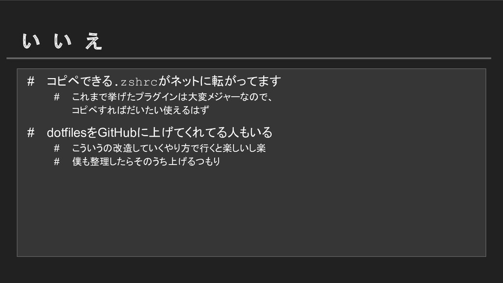 い い え # コピペできる.zshrcがネットに転がってます # これまで挙げたプラグインは大変メジャーなので、 コピペすればだいたい使えるはず # dotfilesをGitHubに上げてくれてる人もいる # こういうの改造していくやり方で行くと楽しいし楽
