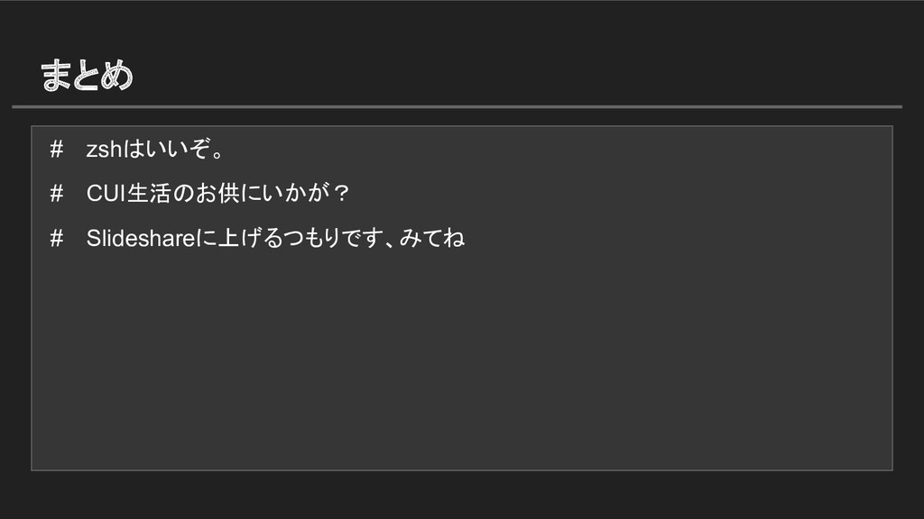 まとめ # zshはいいぞ。 # CUI生活のお供にいかが? # Slideshareに上げるつもりです、みてね
