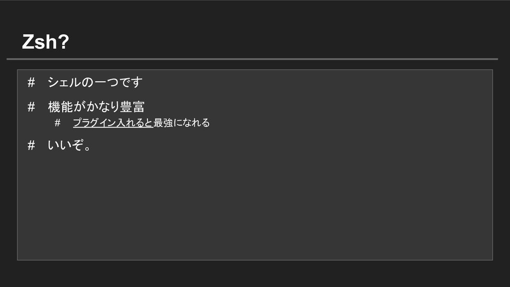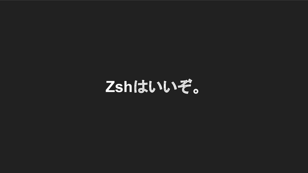 Zsh? # シェルの一つです # 機能がかなり豊富 # プラグイン入れると最強になれる # いいぞ。