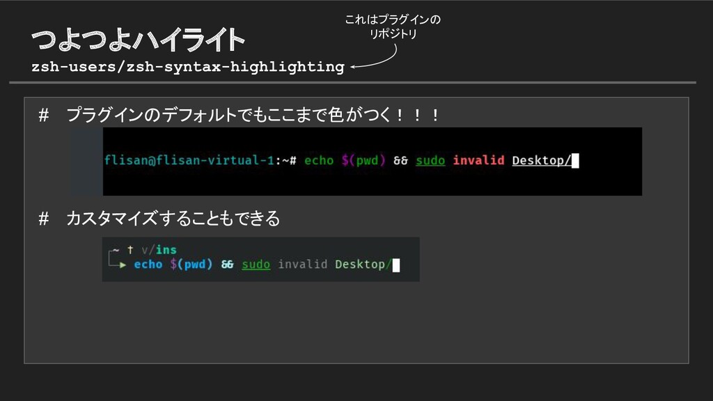 # プラグインのデフォルトでもここまで色がつく!!! # カスタマイズすることもできる つよつよハイライト zsh-users/zsh-syntax-highlighting これはプラグインの リポジトリ