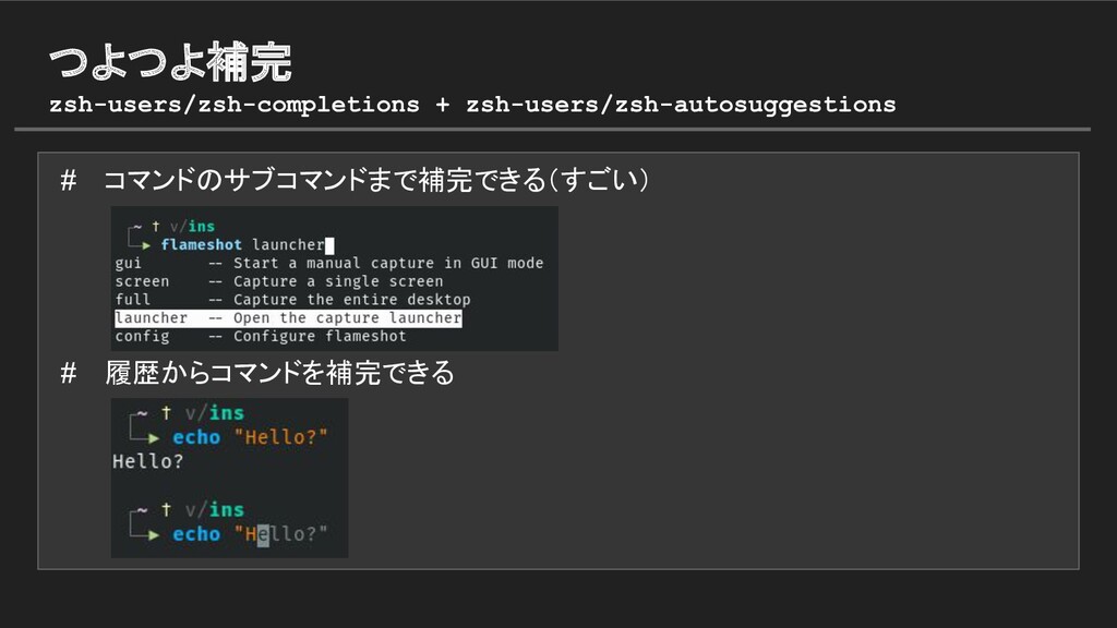 # コマンドのサブコマンドまで補完できる(すごい) # 履歴からコマンドを補完できる つよつよ補完 zsh-users/zsh-completions + zsh-users/zsh-autosuggestions