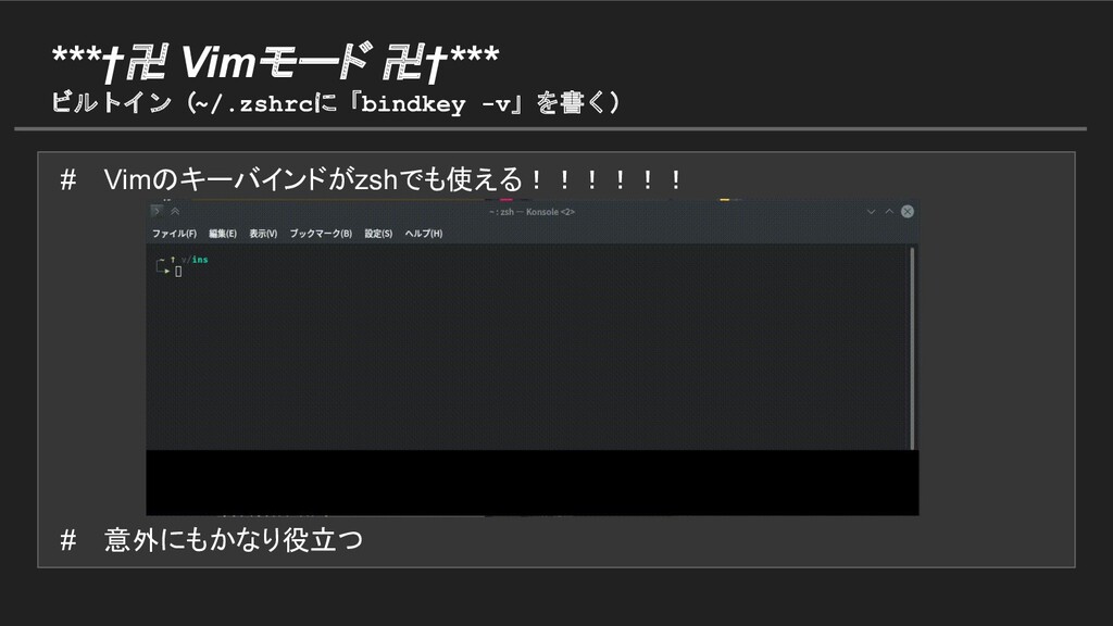 # Vimのキーバインドがzshでも使える!!!!!! # 意外にもかなり役立つ ***†卍 Vimモード 卍†*** ビルトイン(~/.zshrcに「bindkey -v」を書く)