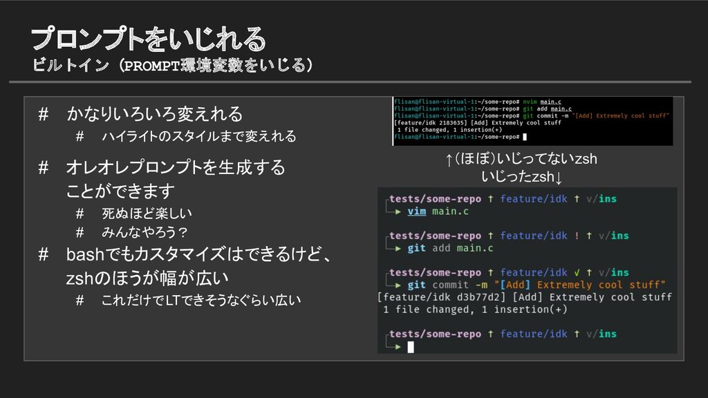 みんなやろう? # bashでもカスタマイズはできるけど、 zshのほうが幅が広い # これだけでLTできそうなぐらい広い ↑(ほぼ)いじってないzsh いじったzsh↓ プロンプトをいじれる ビルトイン(PROMPT環境変数をいじる)