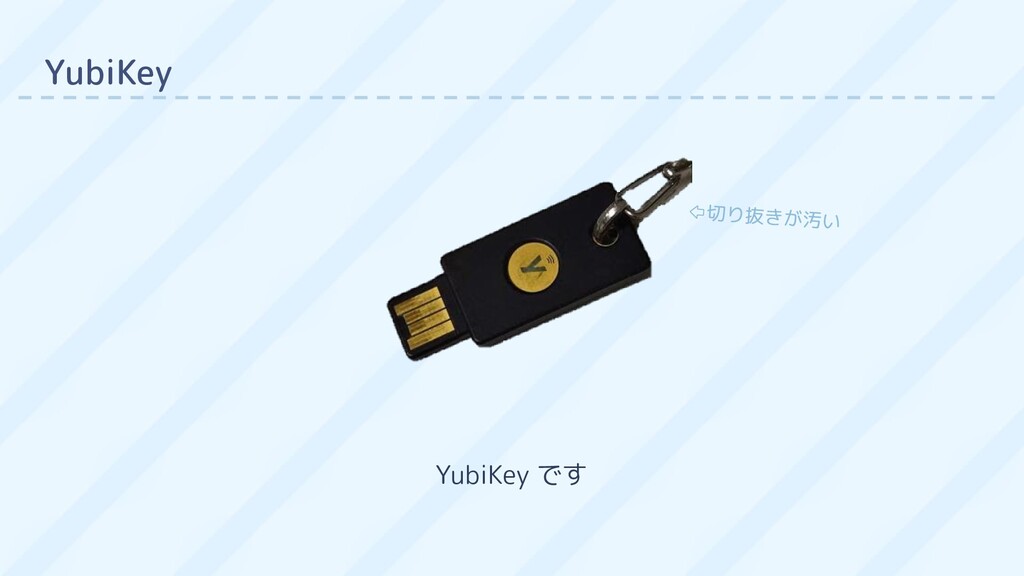 持ってかれたら終わり 落としたら所有者が唯一無二でなくなる (= アイデンティティが崩壊しちゃう) 🔏 FIDO2 これだけで認証 = YubiKey そのものがアイデンティティ