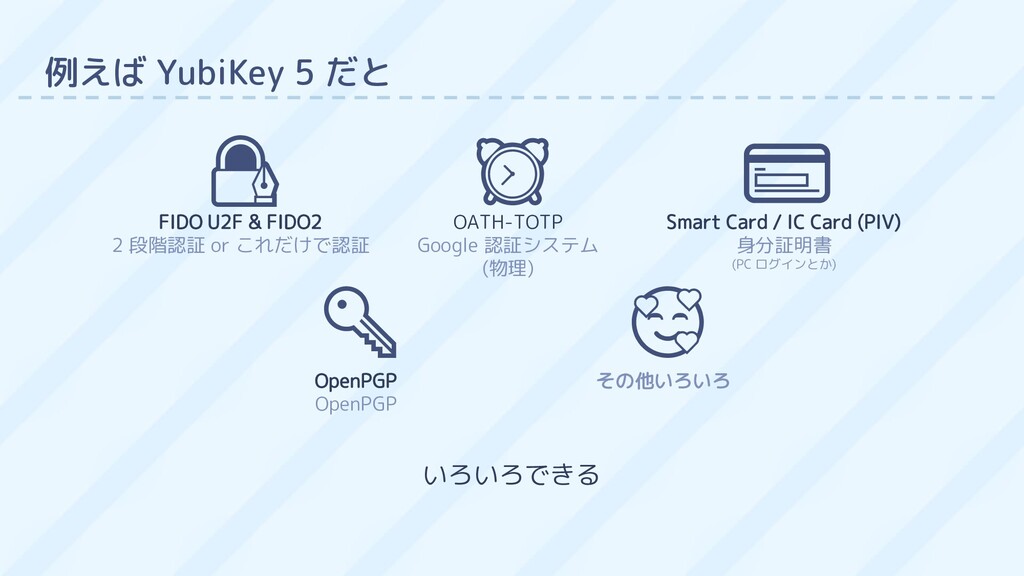 2 段階認証 or これだけで認証 ⏰ OATH-TOTP Google 認証システム (物理) 💳 Smart Card / IC Card (PIV) 身分証明書 (PC ログインとか) 🔑 OpenPGP OpenPGP 🥰 その他いろいろ