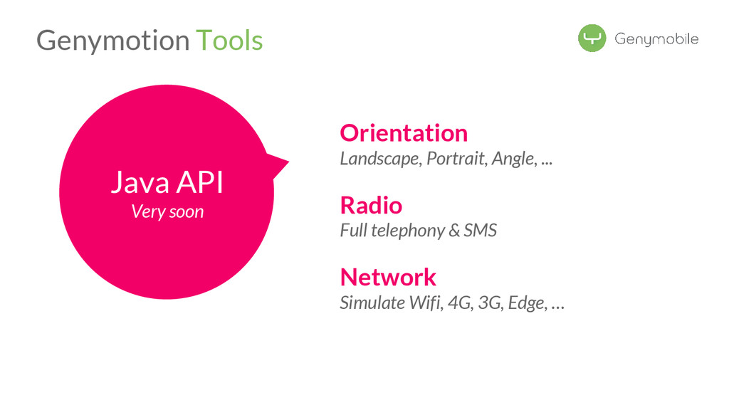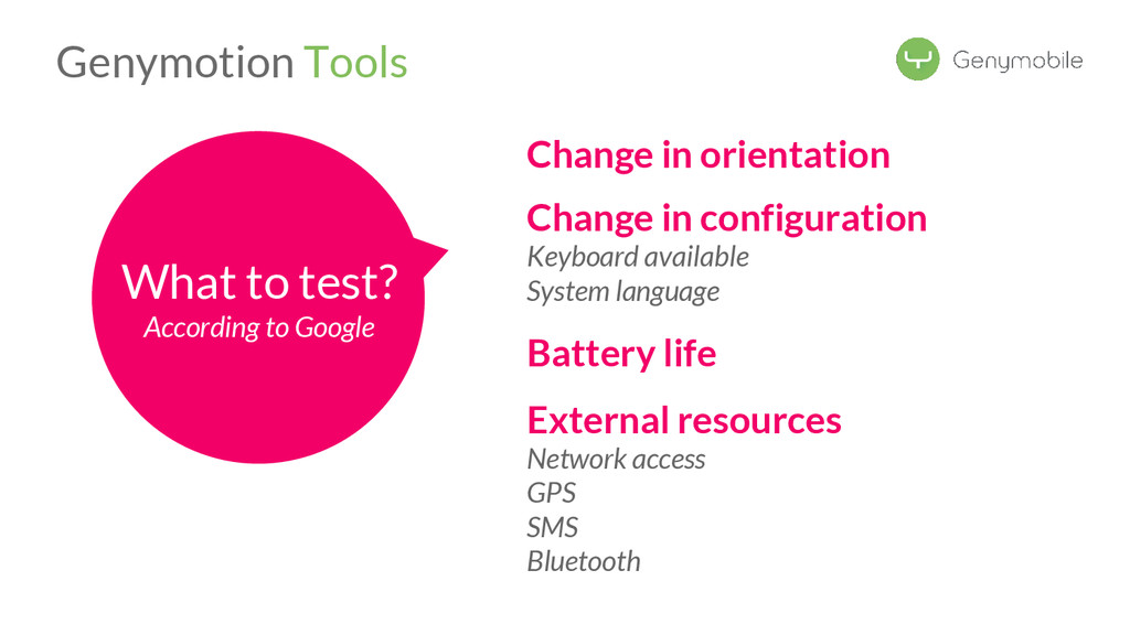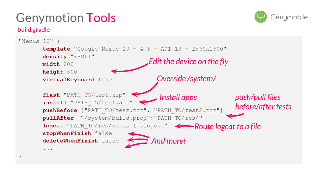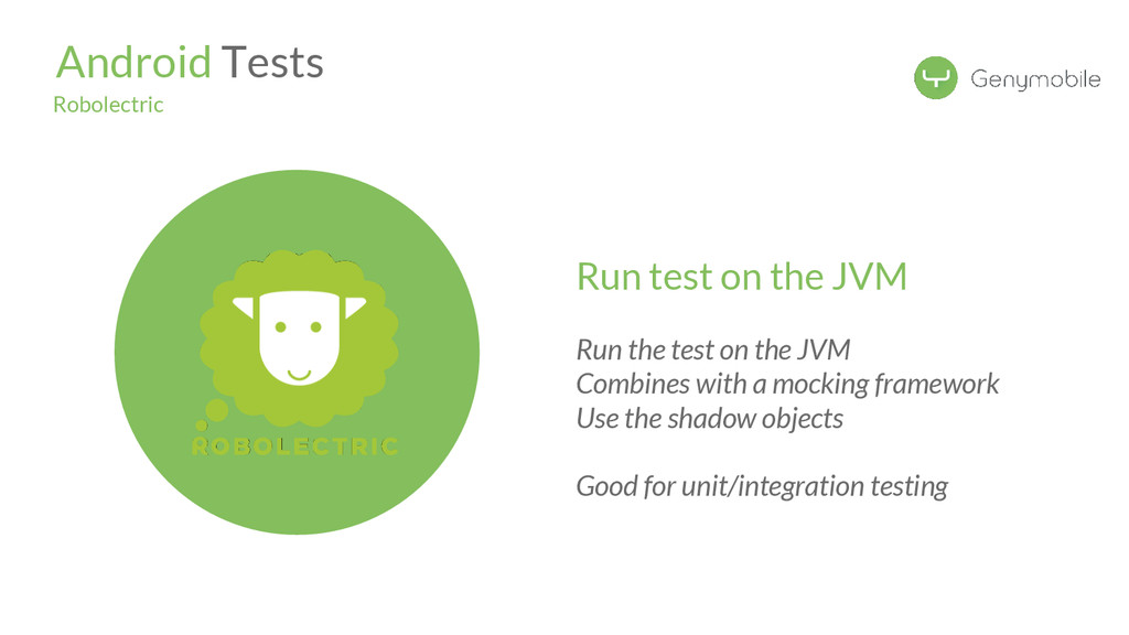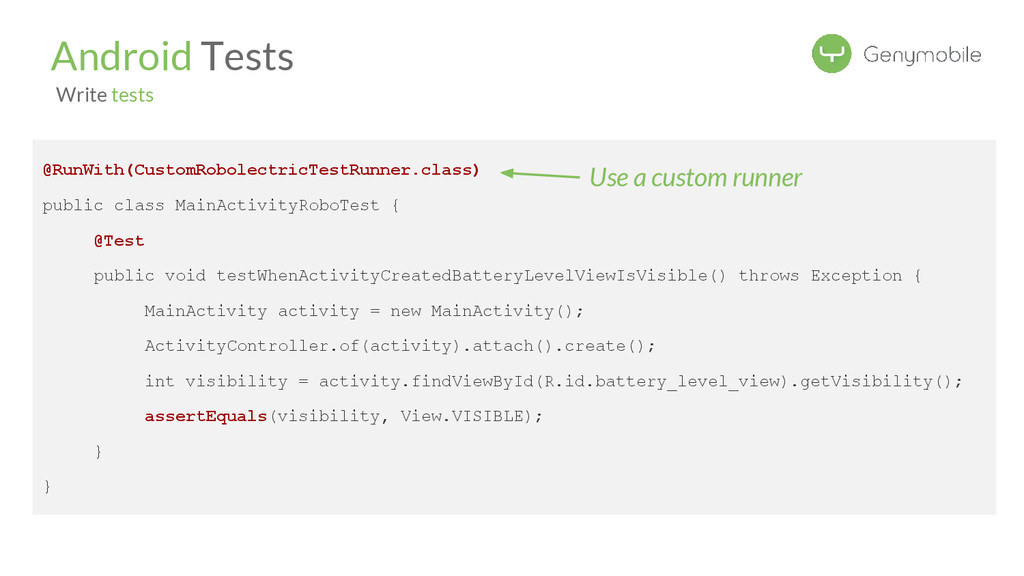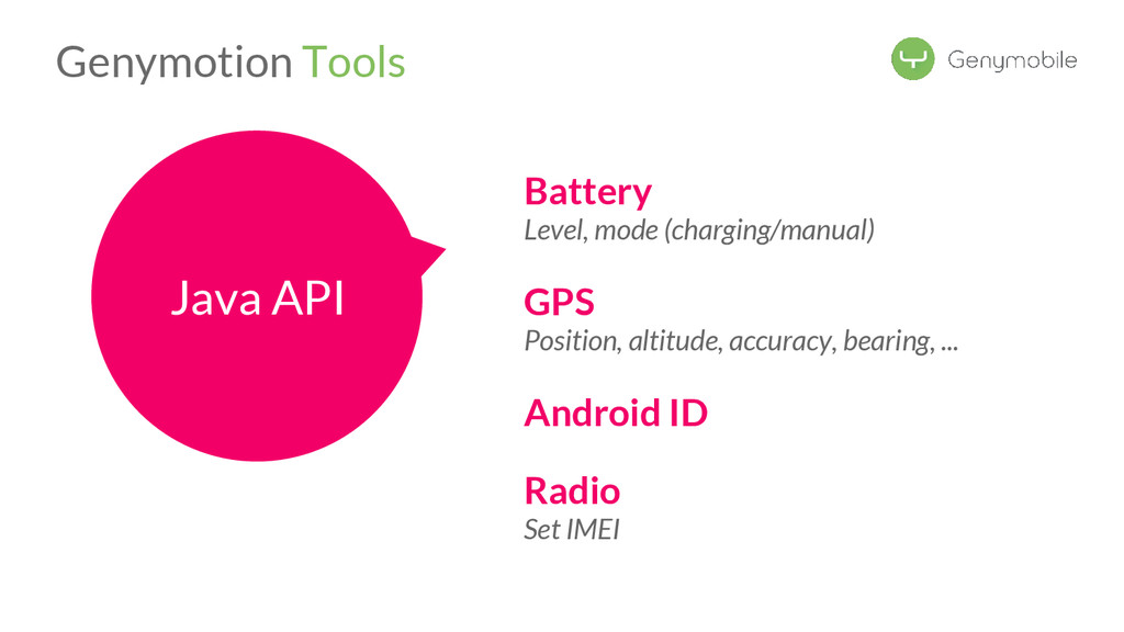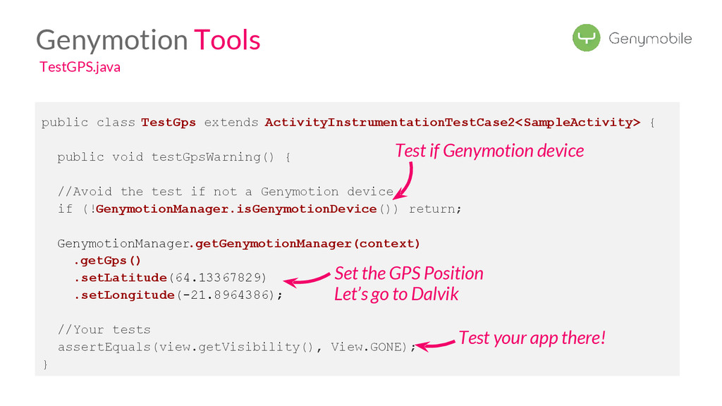 //Avoid the test if not a Genymotion device if (!GenymotionManager.isGenymotionDevice()) return; GenymotionManager.getGenymotionManager(context) .getGps() .setLatitude(64.13367829) .setLongitude(-21.8964386); //Your tests assertEquals(view.getVisibility(), View.GONE); } Test if Genymotion device Set the GPS Position Genymotion Tools TestGPS.java Test your app there! Let’s go to Dalvik