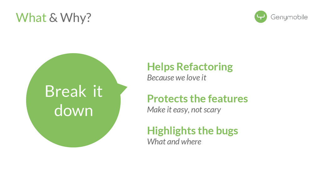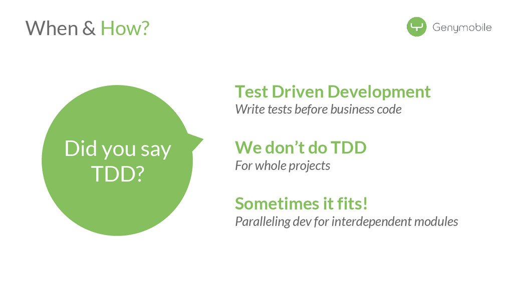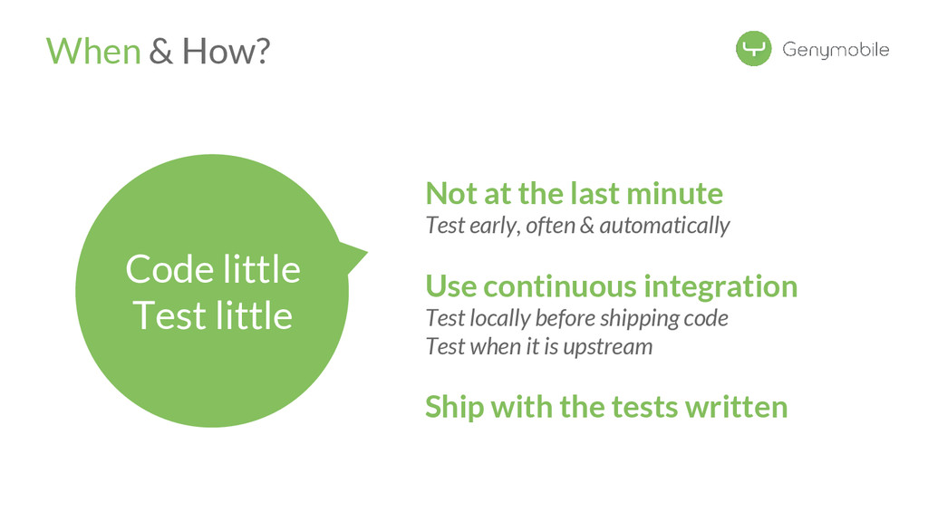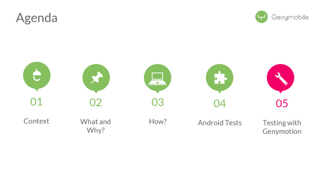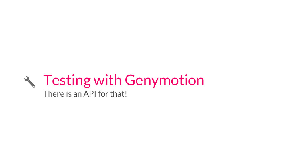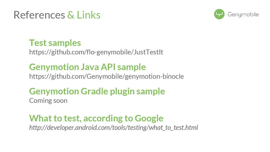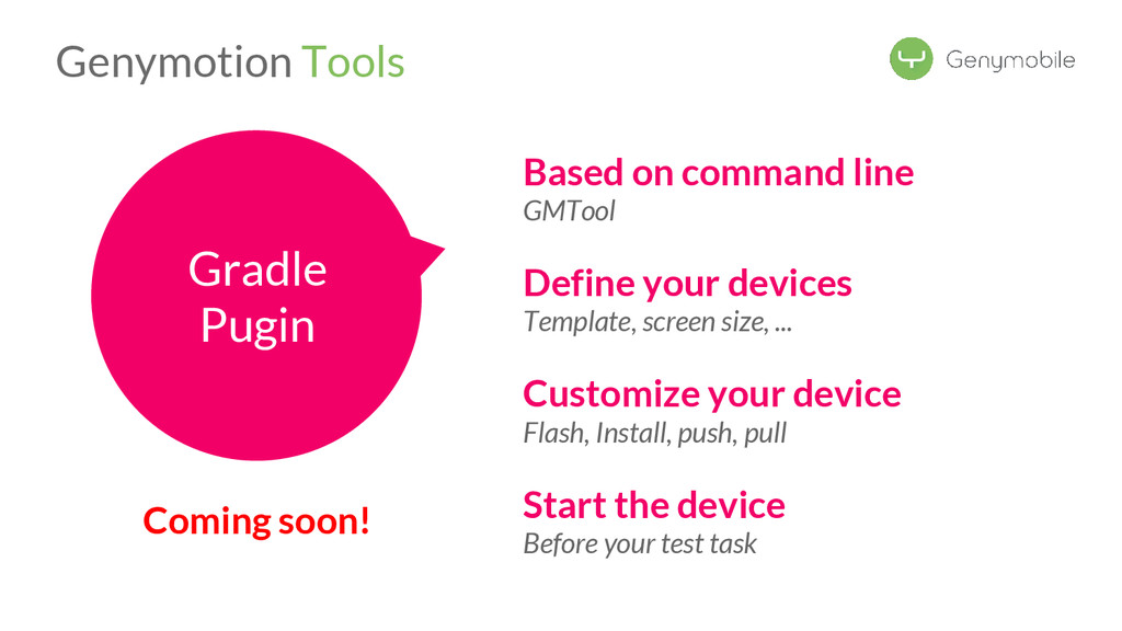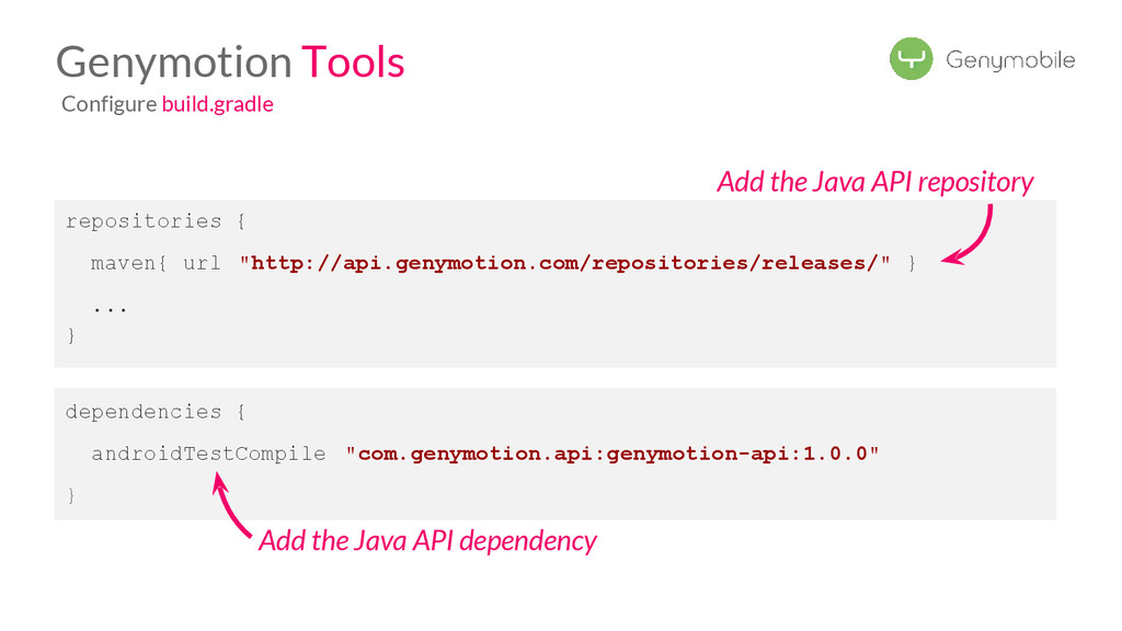 //Avoid the test if not a Genymotion device if (!GenymotionManager.isGenymotionDevice()) return; GenymotionManager.getGenymotionManager(context) .getGps() .setLatitude(64.13367829) .setLongitude(-21.8964386); //Your tests assertEquals(view.getVisibility(), View.GONE); } Test if Genymotion device Set the GPS Position Genymotion Tools TestGPS.java Test your app there! Let’s go to Dalvik
