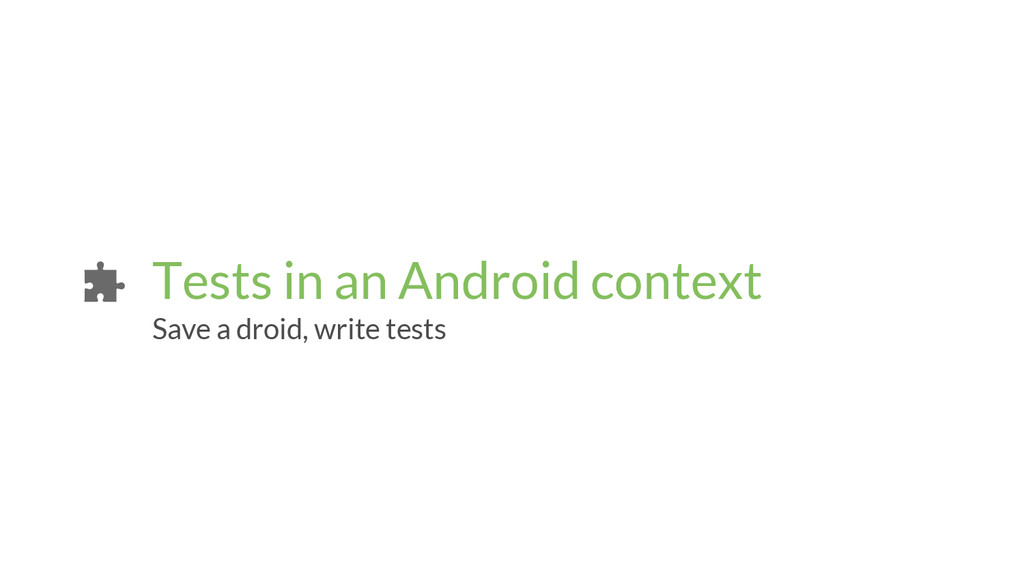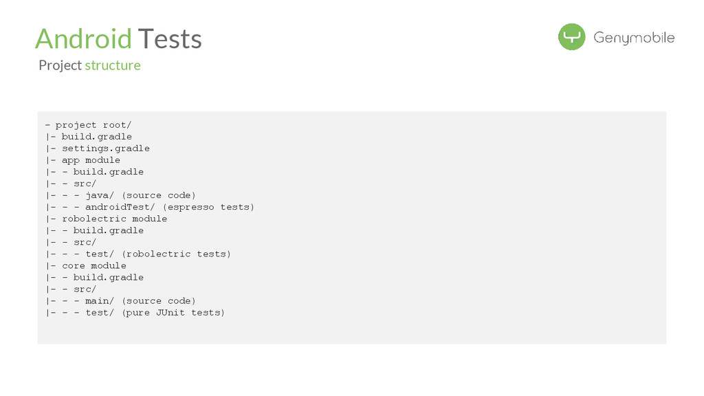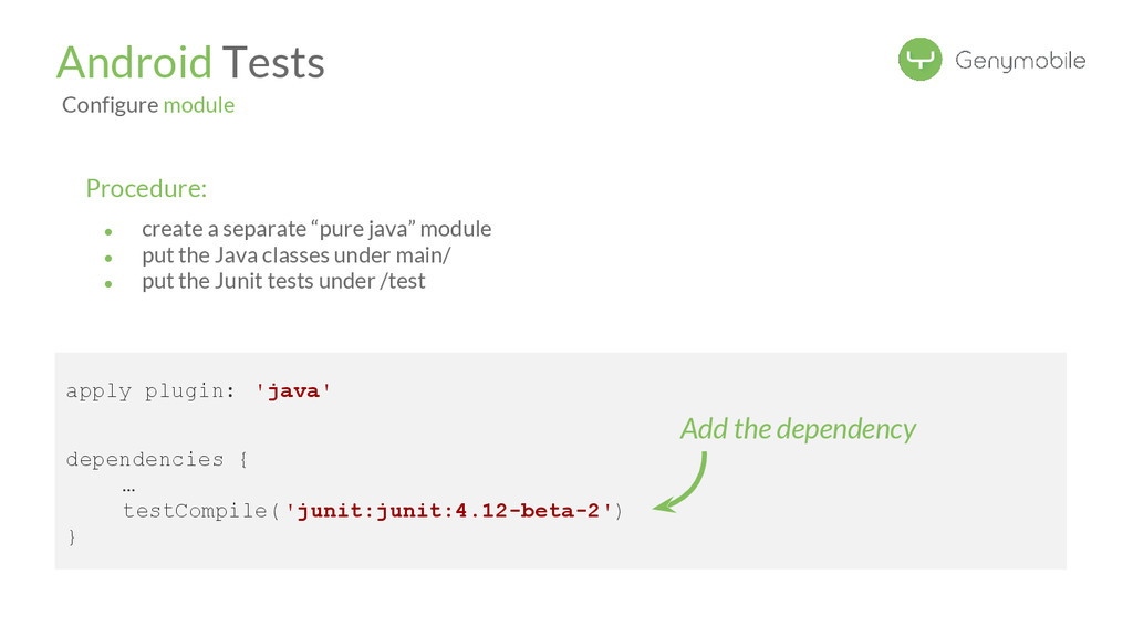 dependency Android Tests Configure module Procedure: • create a separate “pure java” module • put the Java classes under main/ • put the Junit tests under /test