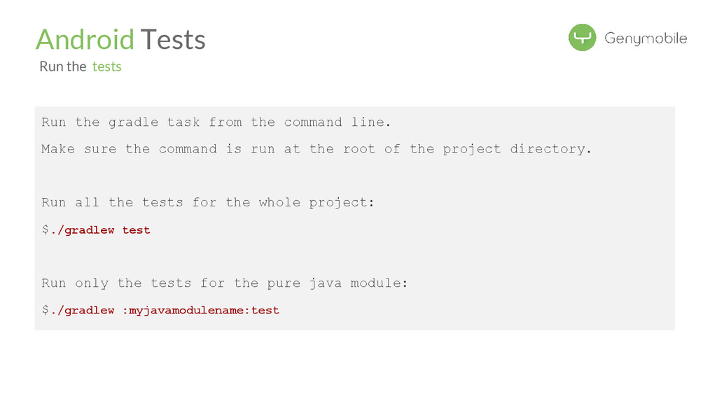 the command is run at the root of the project directory. Run all the tests for the whole project: $./gradlew test Run only the tests for the pure java module: $./gradlew :myjavamodulename:test Android Tests Run the tests