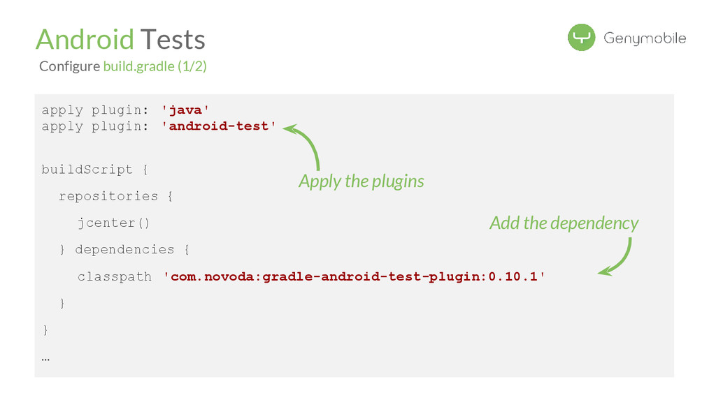 'org.robolectric:robolectric:2.3') androidTestCompile( 'junit:junit:4.12-beta-2') … } Add the dependencies Android Tests Configure build.gradle (2/2) Tell the plugin which module you test