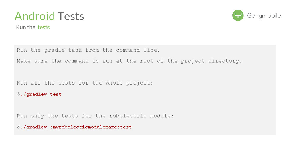 the command is run at the root of the project directory. Run all the tests for the whole project: $./gradlew test Run only the tests for the robolectric module: $./gradlew :myrobolecticmodulename:test Android Tests Run the tests