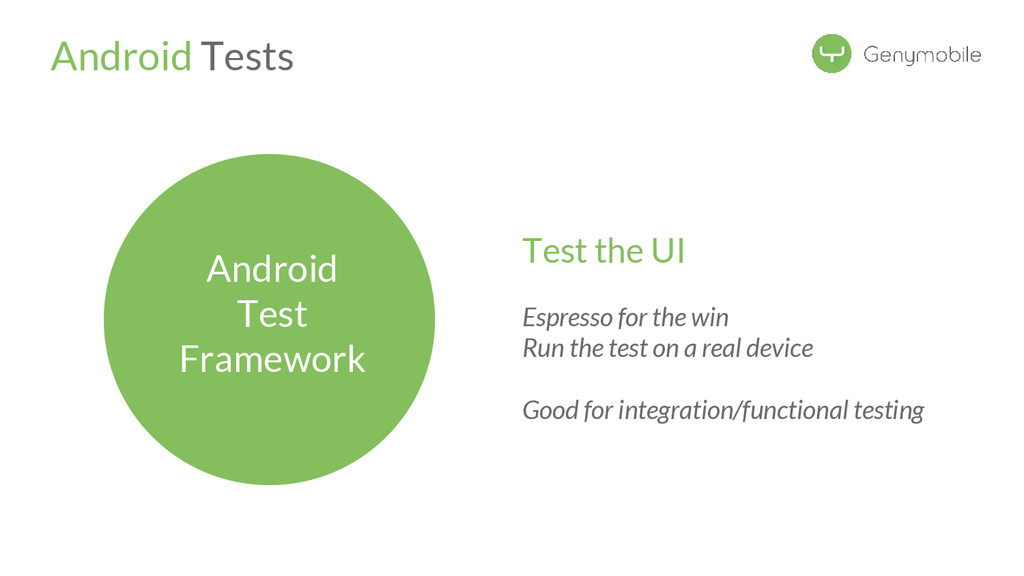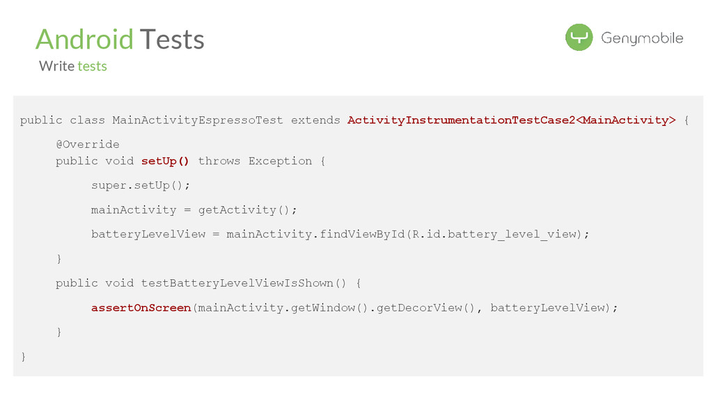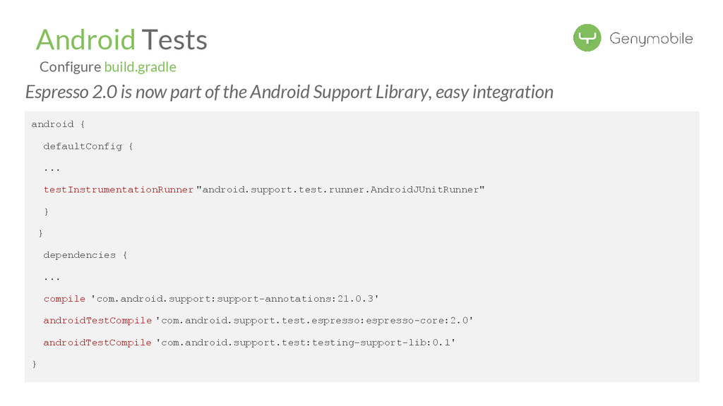 { ... compile 'com.android.support:support-annotations:21.0.3' androidTestCompile 'com.android.support.test.espresso:espresso-core:2.0' androidTestCompile 'com.android.support.test:testing-support-lib:0.1' } Android Tests Configure build.gradle Espresso 2.0 is now part of the Android Support Library, easy integration