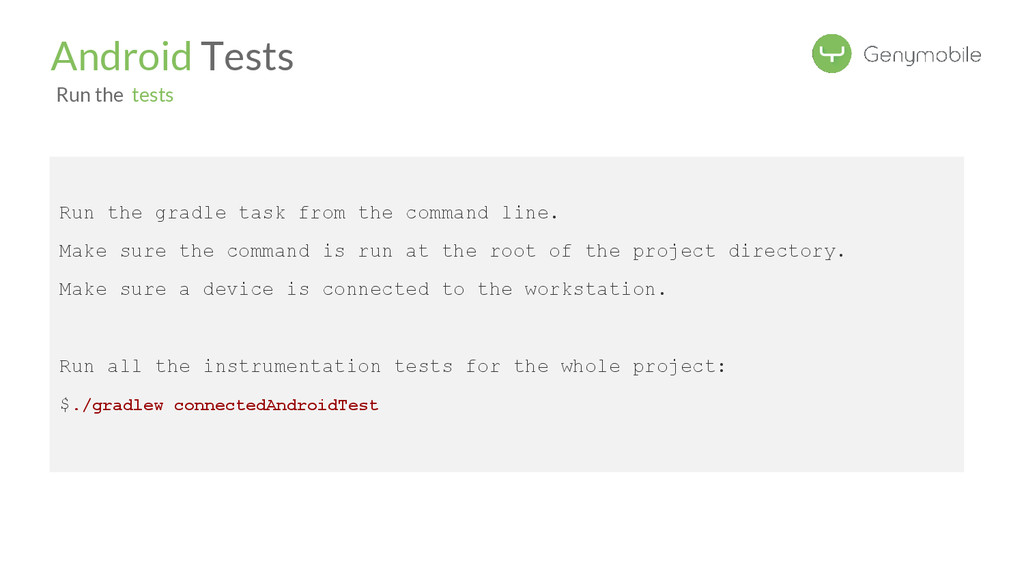 the command is run at the root of the project directory. Make sure a device is connected to the workstation. Run all the instrumentation tests for the whole project: $./gradlew connectedAndroidTest Android Tests Run the tests