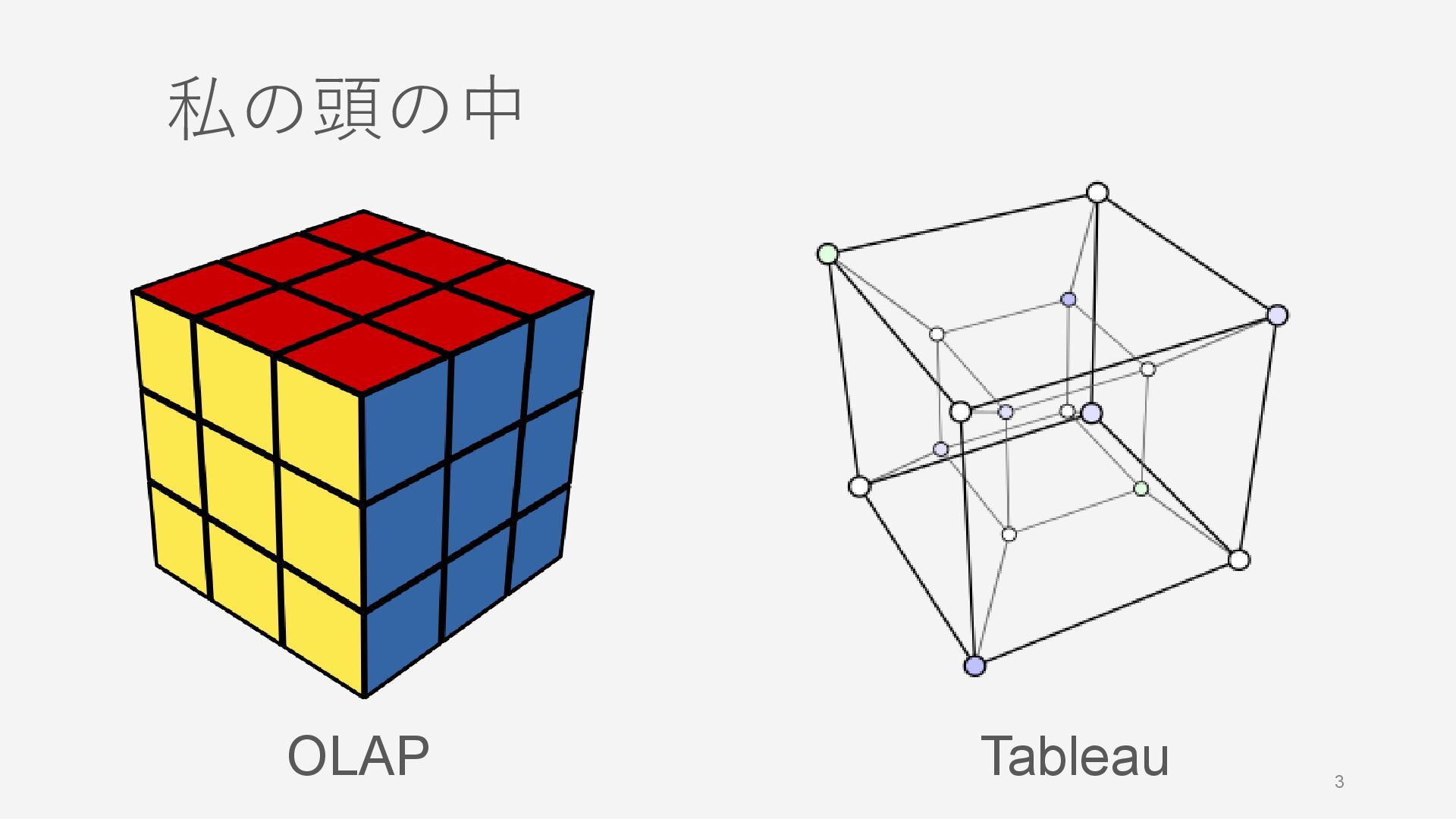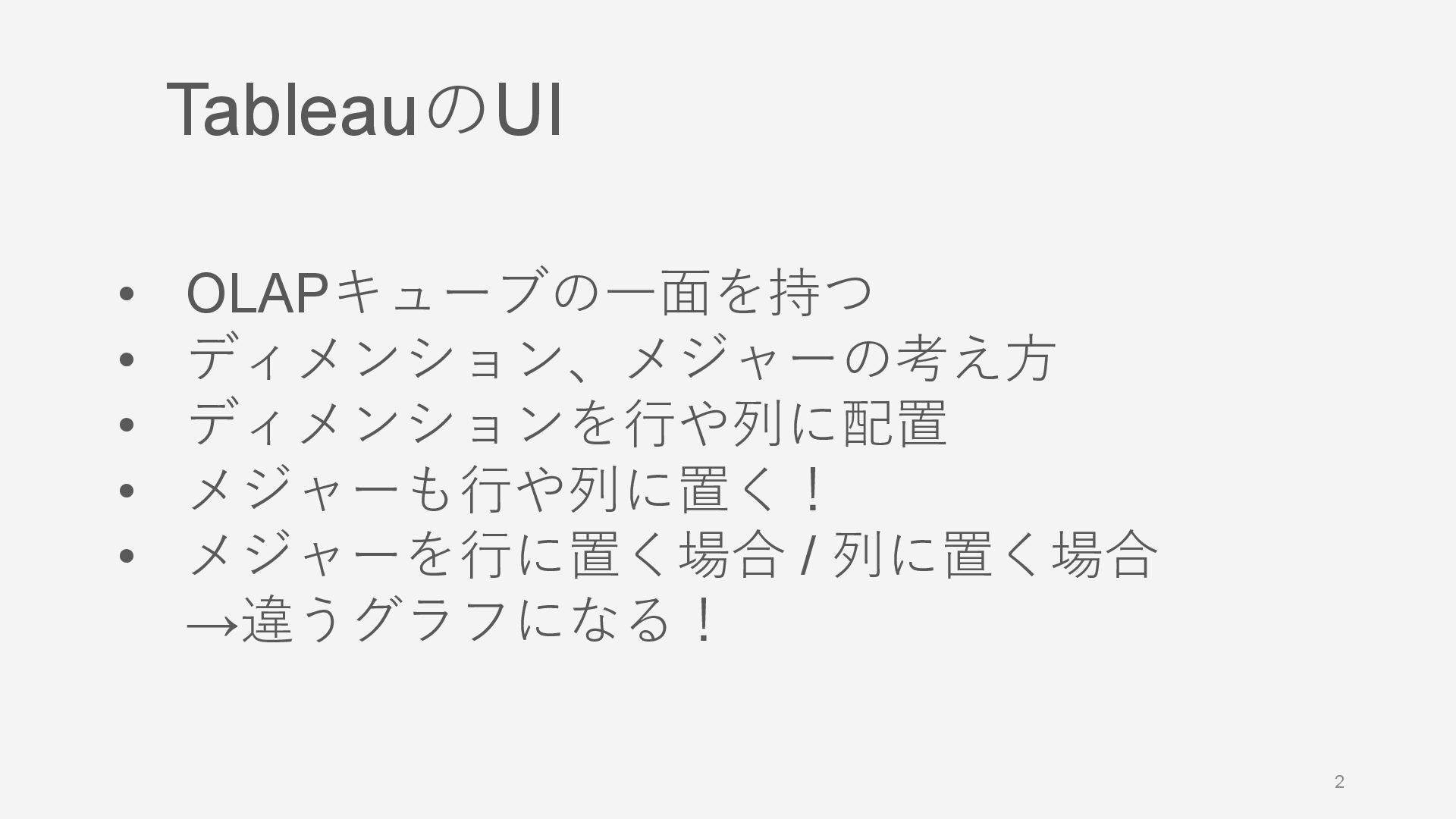 2 TableauのUI • OLAPキューブの一面を持つ • ディメンション、メジャーの考え方 • ディメンションを行や列に配置 • メジャーも行や列に置く!