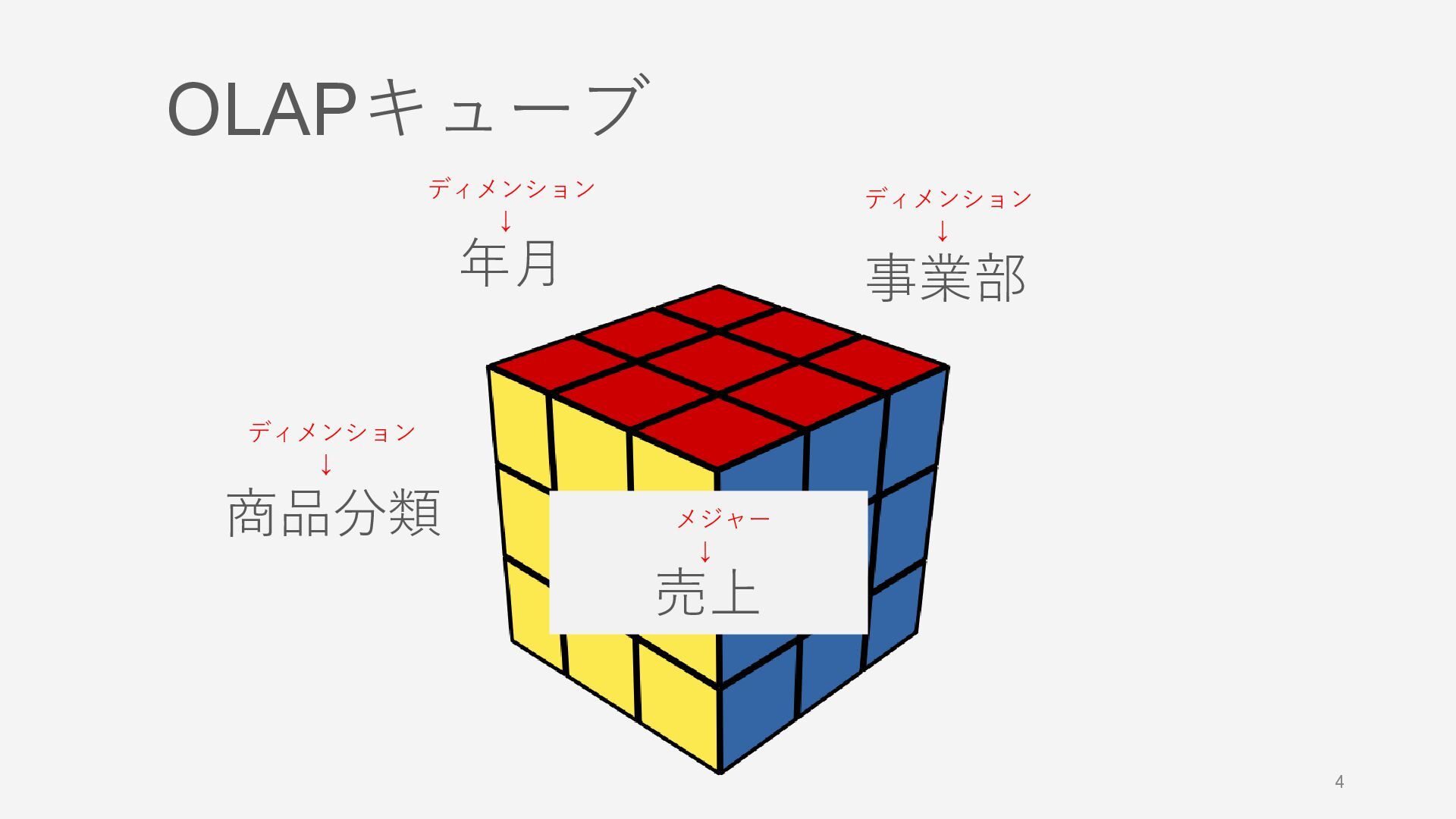 4 OLAPキューブ 商品分類 年月 事業部 売上 ディメンション ↓ ディメンション ↓