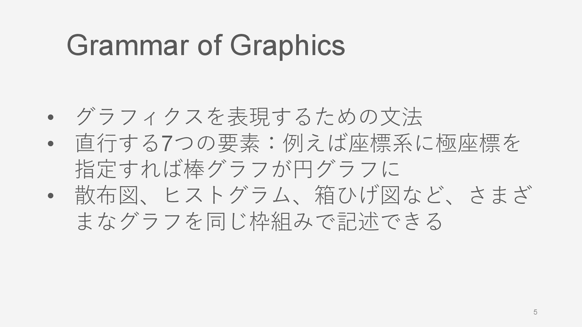 散布図、ヒストグラム、箱ひげ図など、さまざ まなグラフを同じ枠組みで記述できる